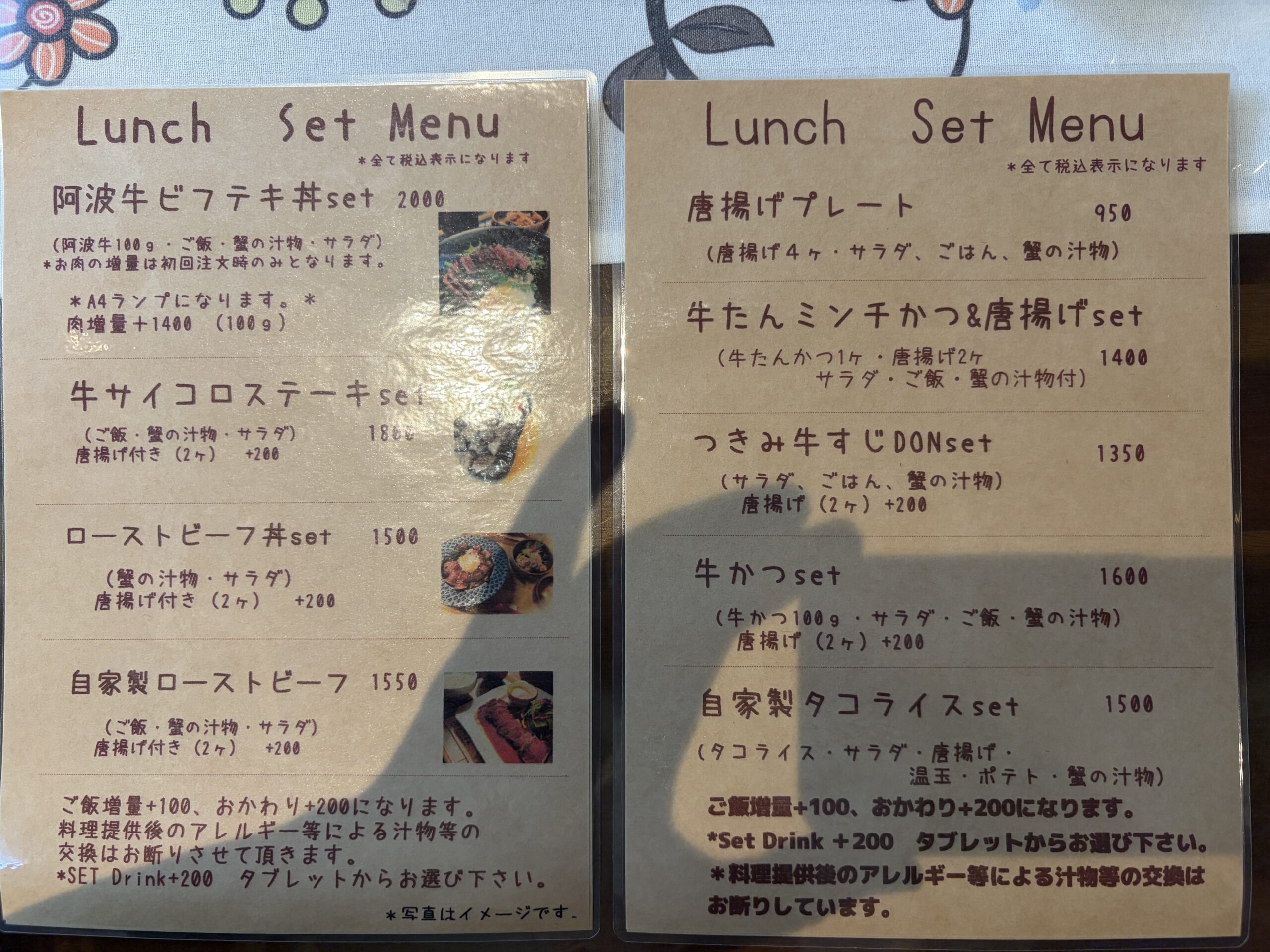 私は「牛たんミンチかつ&唐揚げSet」、家内は「牛サイコロステーキSet」を注文。汁物は蟹の味噌汁なのですが、別のものに変えることができるらしいのでスタッフの方にお願いすると「ワカメのすまし汁」とのこと。それならと私も家内もすまし汁に変えていただくことにしました。しばらくして料理が運ばれてきました。