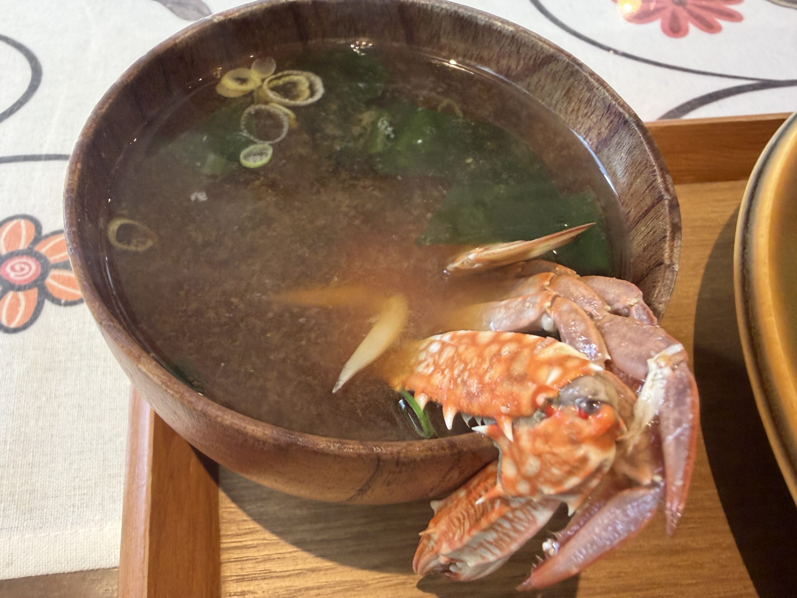 汁物は「すまし汁」と思っていたのですが、どう見てもいつもの蟹の味噌汁のようです。蟹を皿に避けて啜ってみるとやはりいつもの蟹の味噌汁でした。