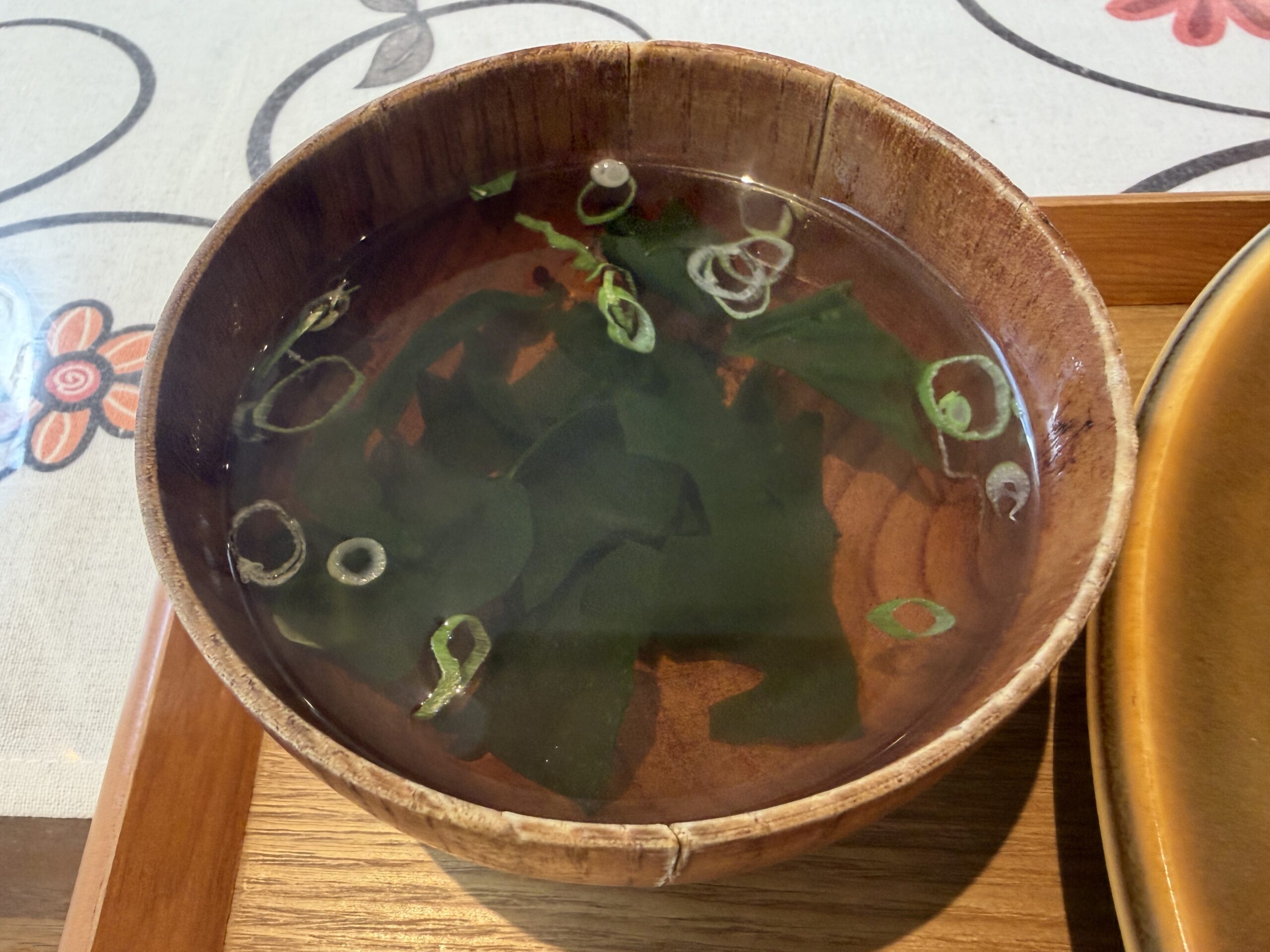 そのまま食べ進めていると、スタッフの方が気付いてワカメのすまし汁に取り替えてくれました。