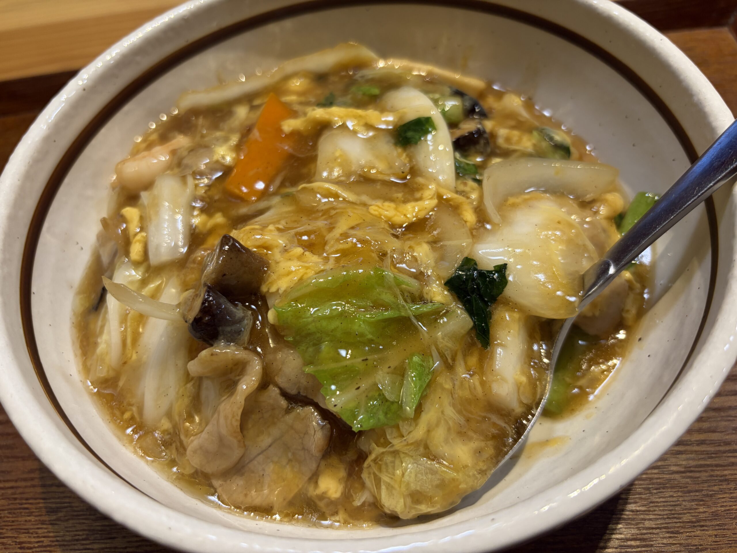 しばらくして中華丼が運ばれてきました。とても良い香りが漂ってきて食欲が湧いてきます。熱々で具沢山の餡は薄味で生姜も効いていてとても美味しくいただけます。