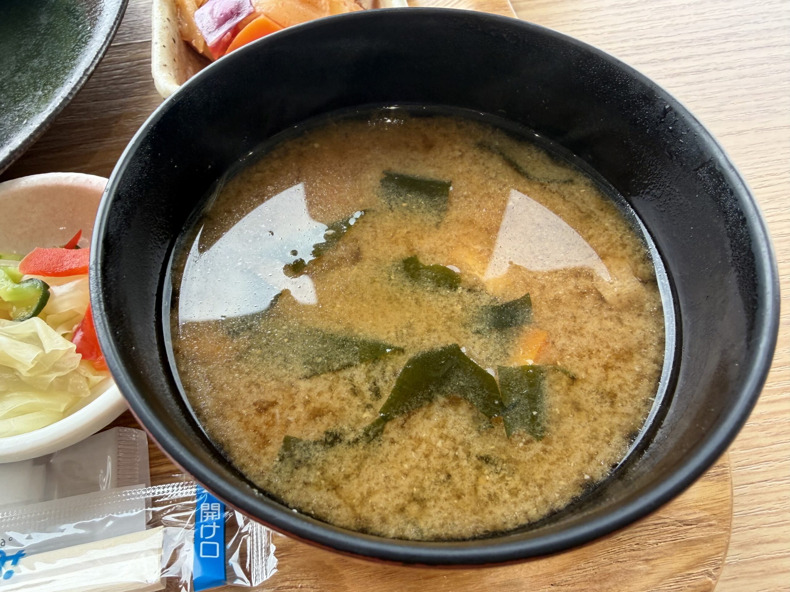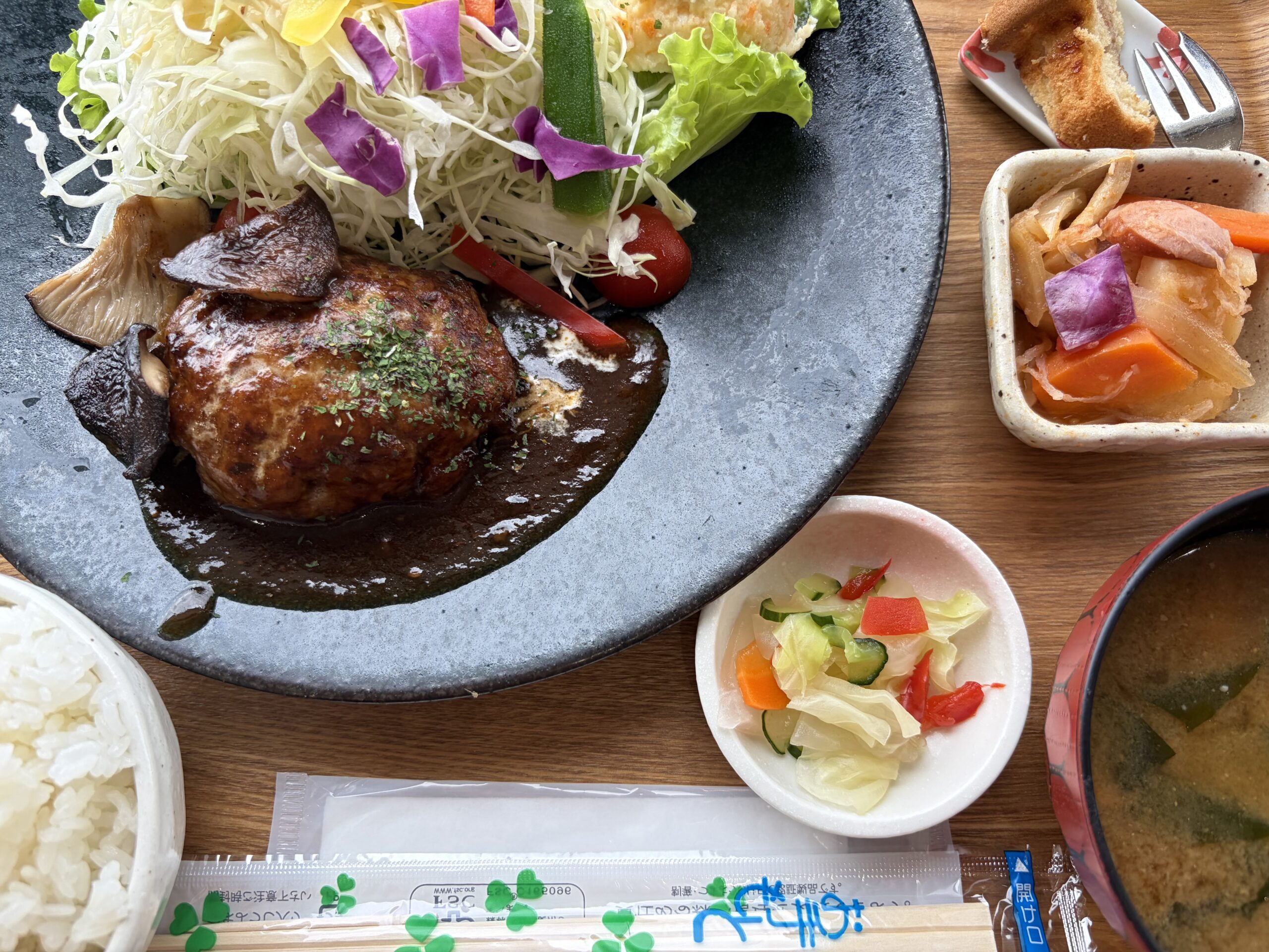 メインのハンバーグの皿には野菜がたっぷり盛られています。胡麻ドレッシングが食欲をそそります。残念ながらしいたけは火が通り過ぎていて香りがなくなっていました。味噌仕立てのデミグラスソースはほんのりとした甘みが感じられてハンバーグに良く合っています。