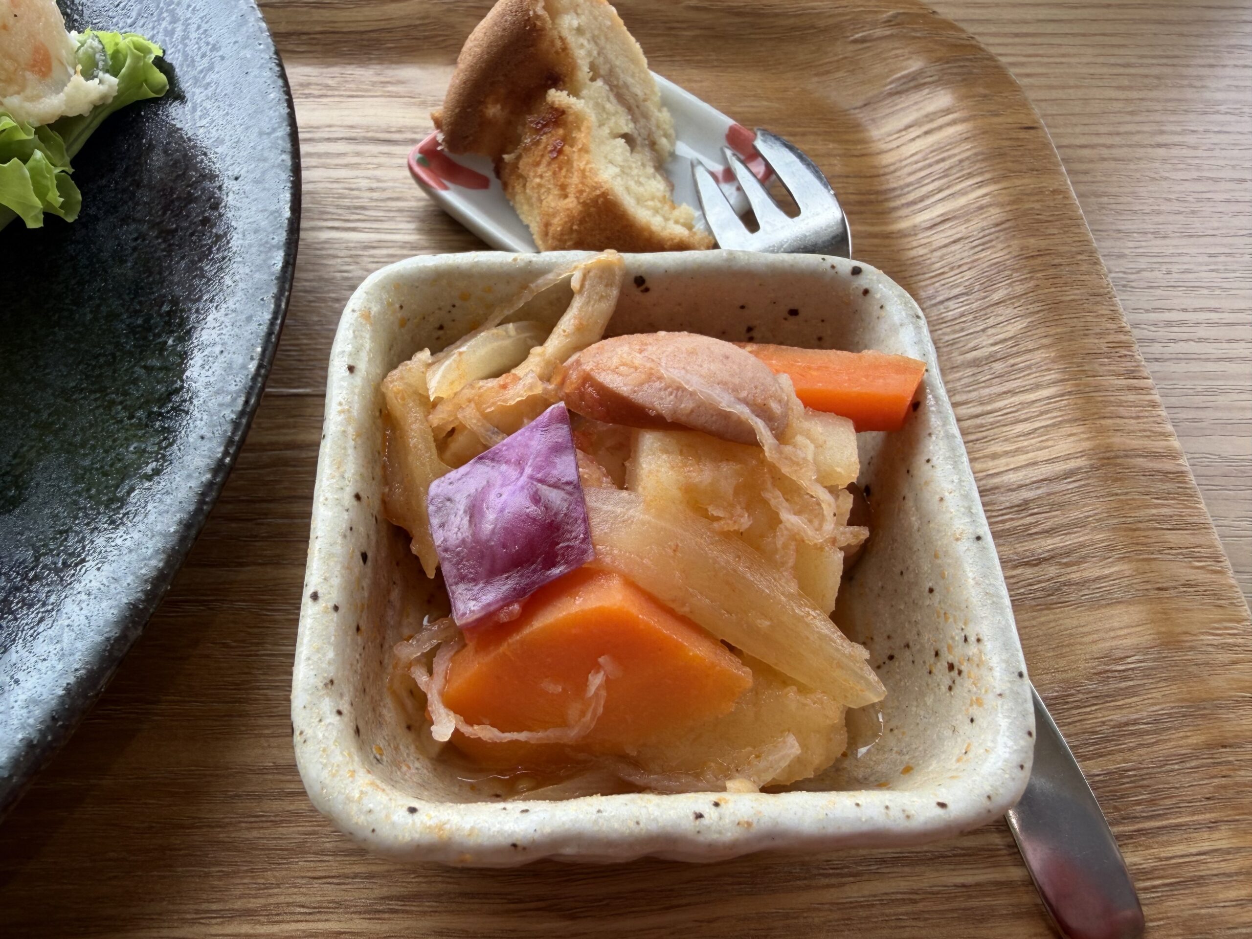 小鉢は肉の代わりにウィンナーソーセージが入った肉じゃが。じゃがいもは良く煮えていてホロホロになっていました。奥に見えているのはデザートのカップケーキ。