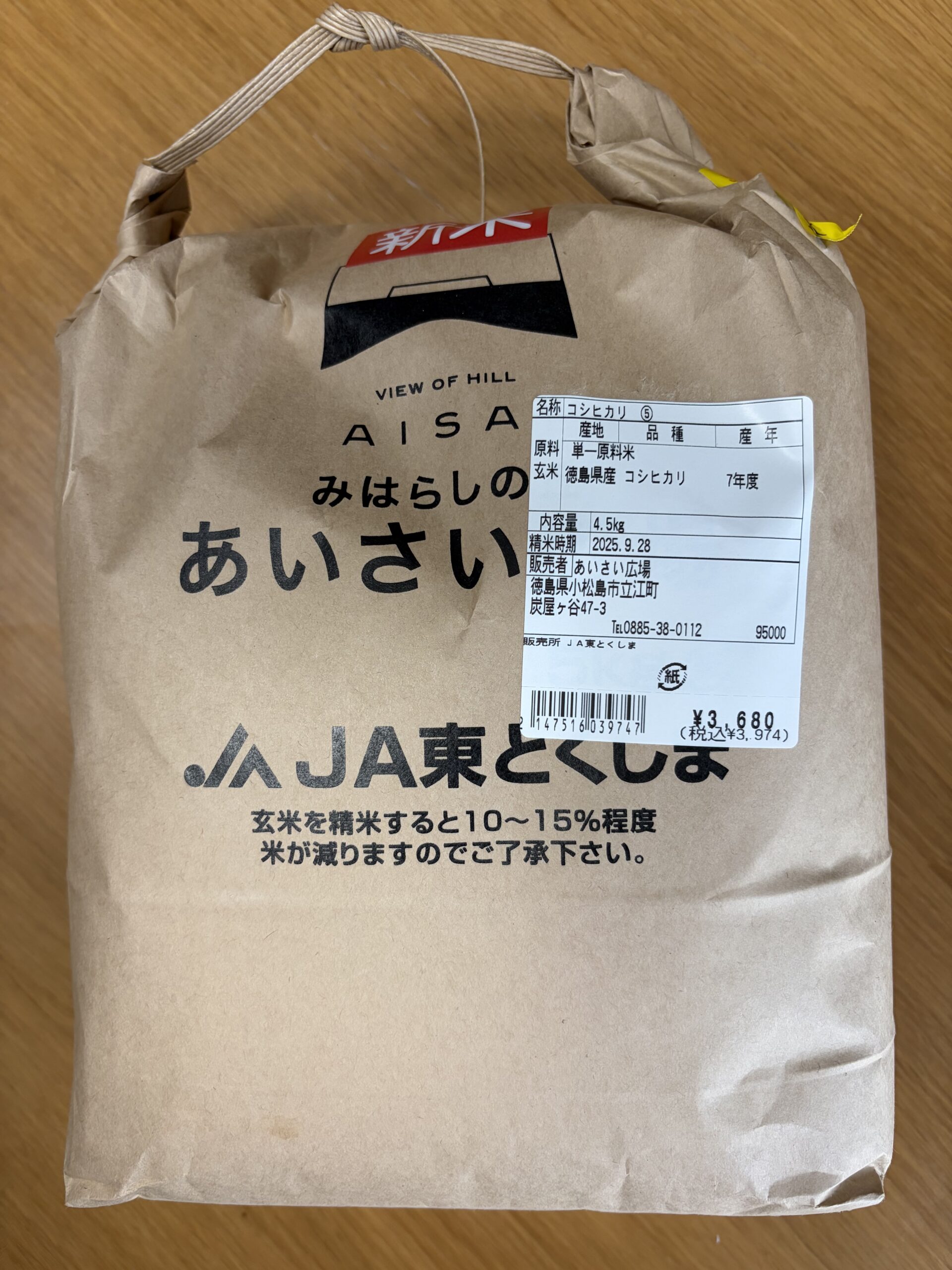 目的のお米はたくさん出ていた新米の中で「徳島県産コシヒカリ」を買いました。3,680円でしたが、良く見ると5㎏ではなくて4.5㎏でした。5㎏に換算すると4,088円です。米価が下がることはあるのでしょうか。