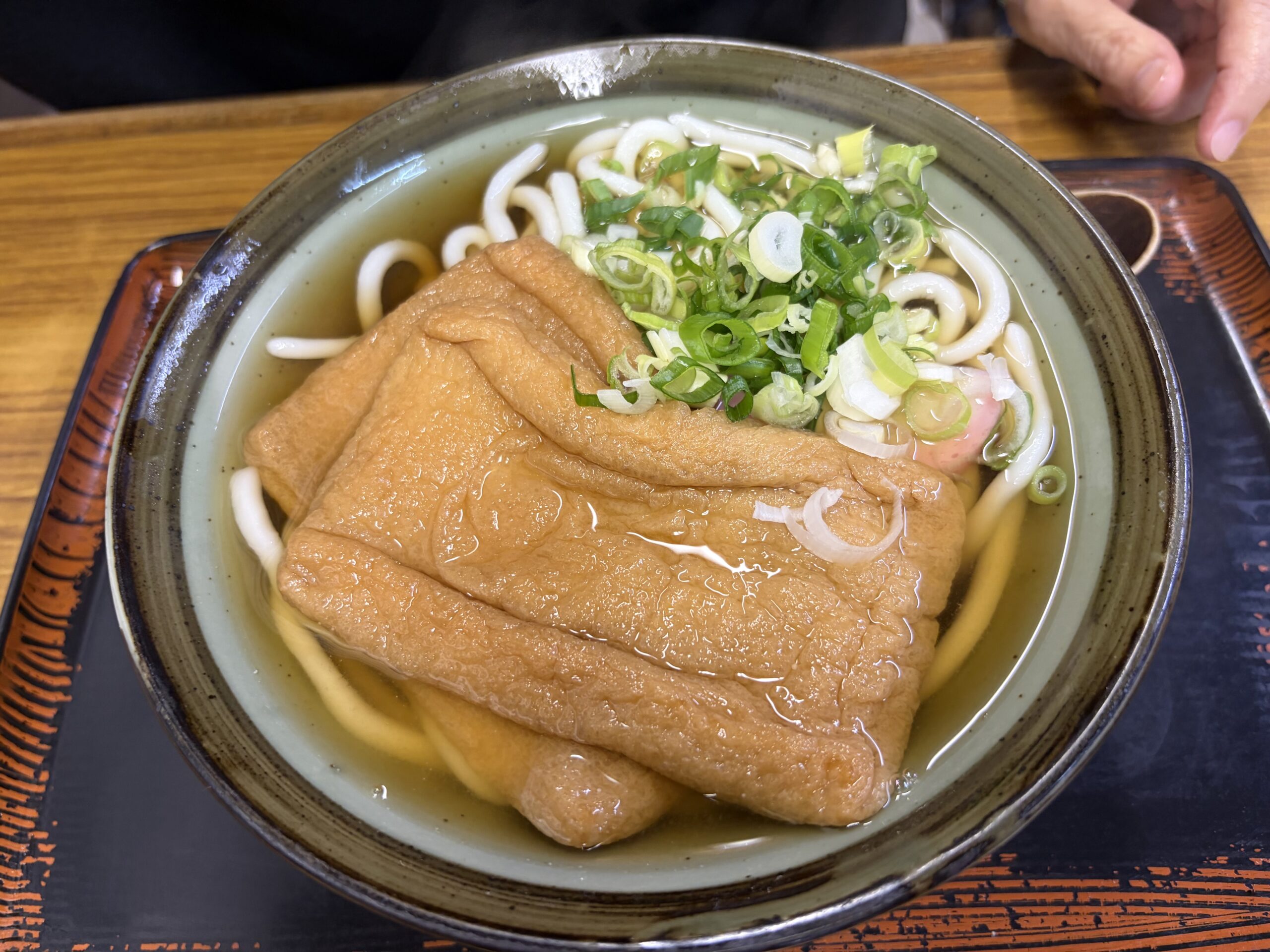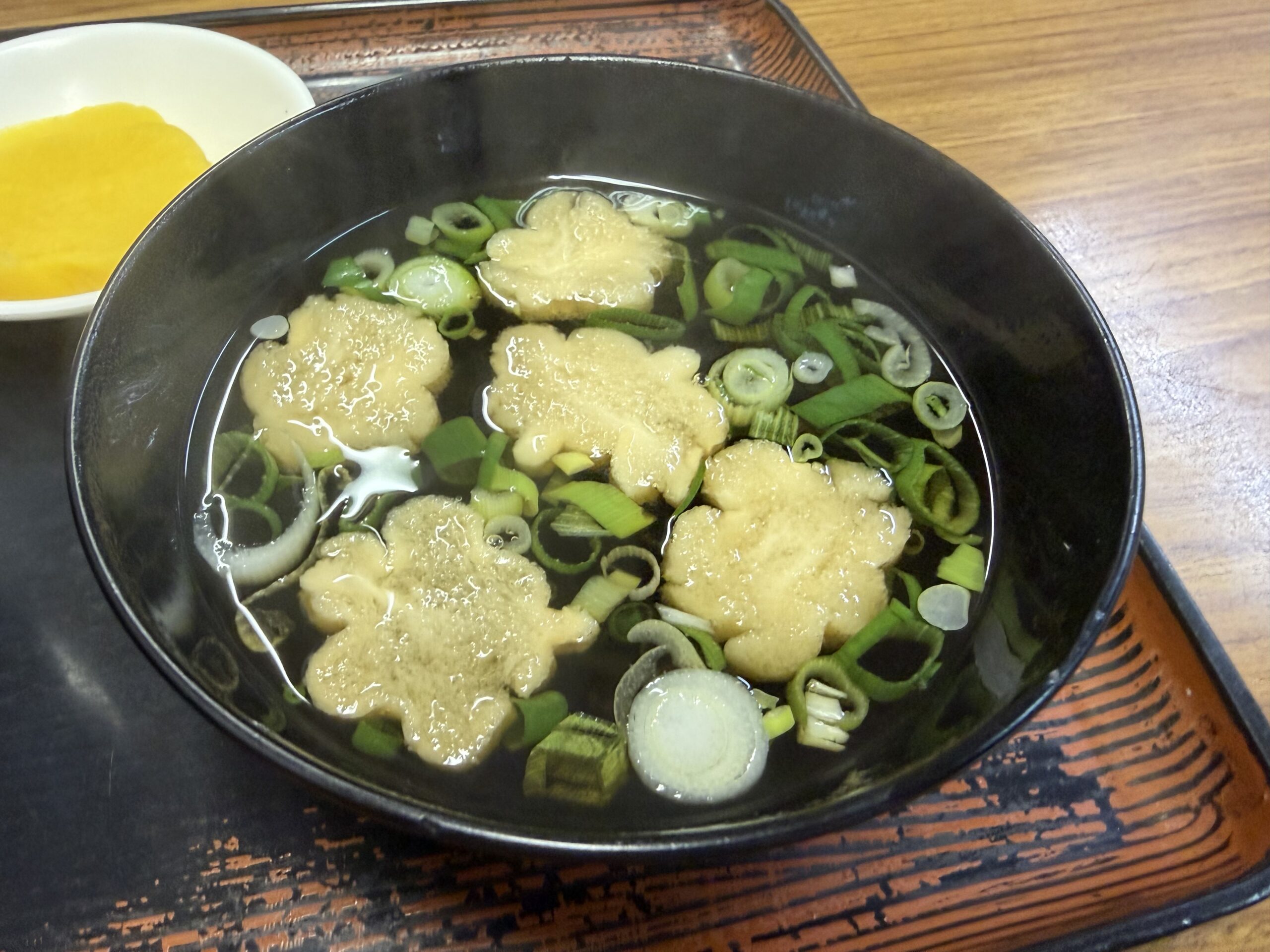 店内を覗くとカウンターとテーブル席だったので、こちらの店でお昼をいただくことにしました。店に入るとテーブル席が空いていて直ぐに案内されました。家内は「キツネうどん」、私は「カツ丼」を注文。最初に運ばれてきたのは家内の「キツネうどん」でした。