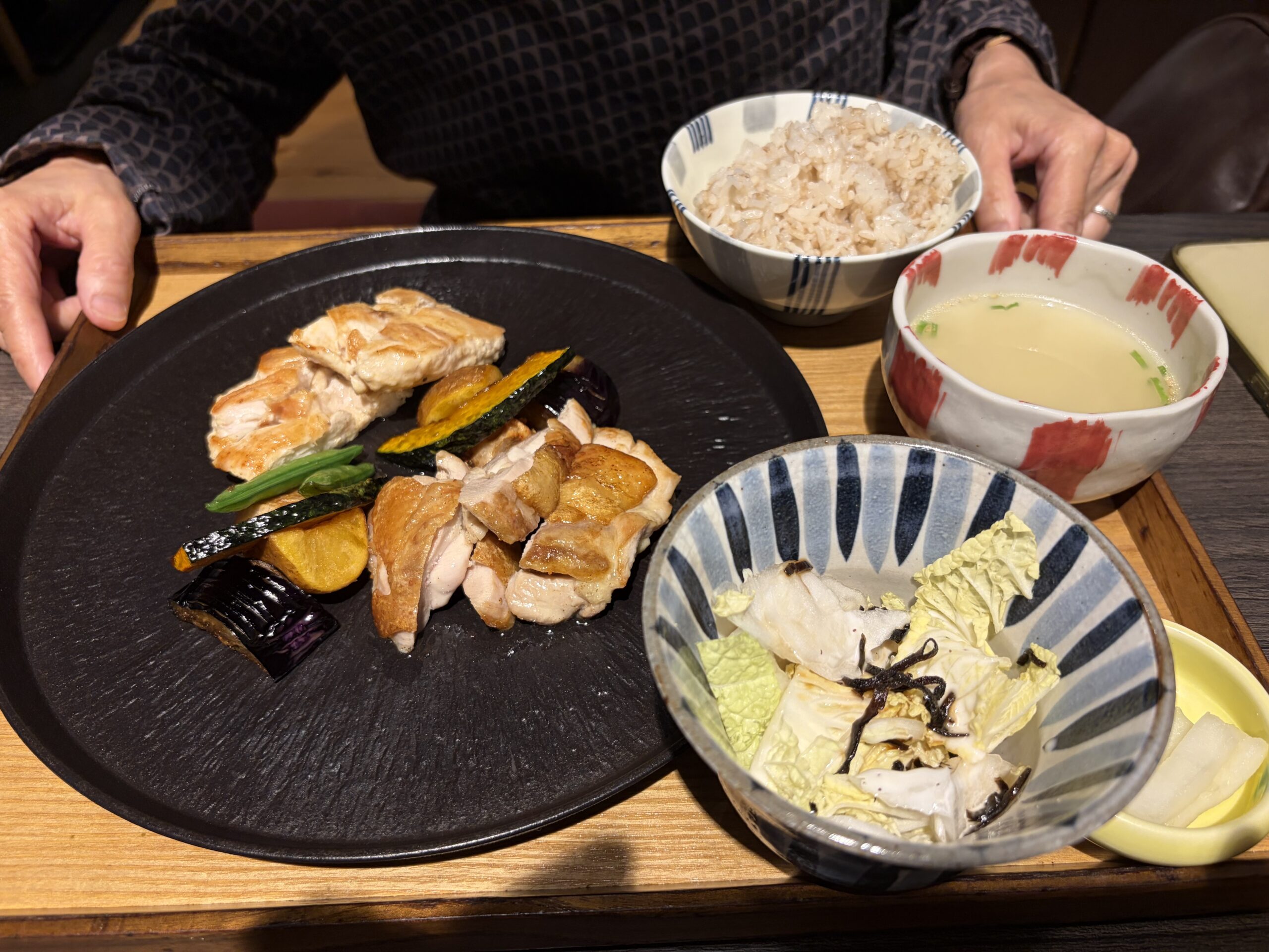 家内は「熊本産うまかハーブ鶏 もも肉・むね肉の鉃板焼御膳」、私は昨日に続いて「かしわのチキンカツ丼」を注文。しばらくして家内の注文した料理が運ばれてきました。