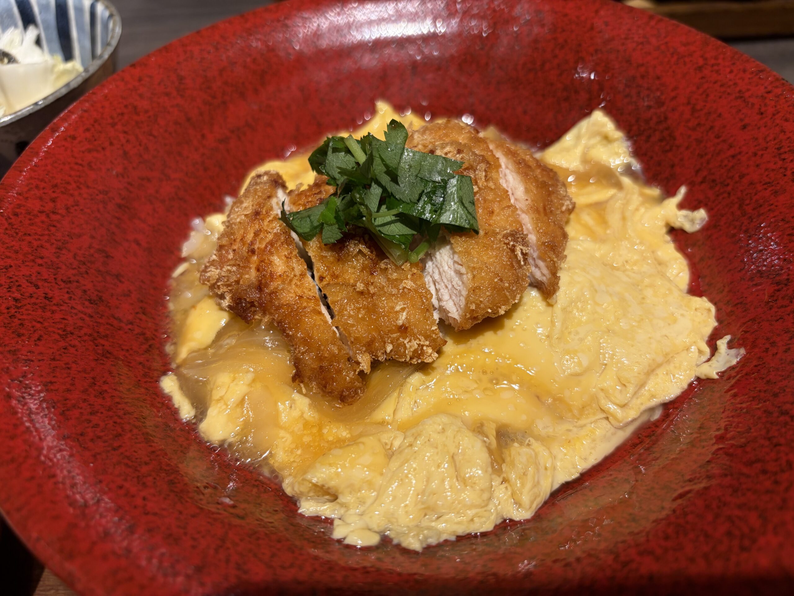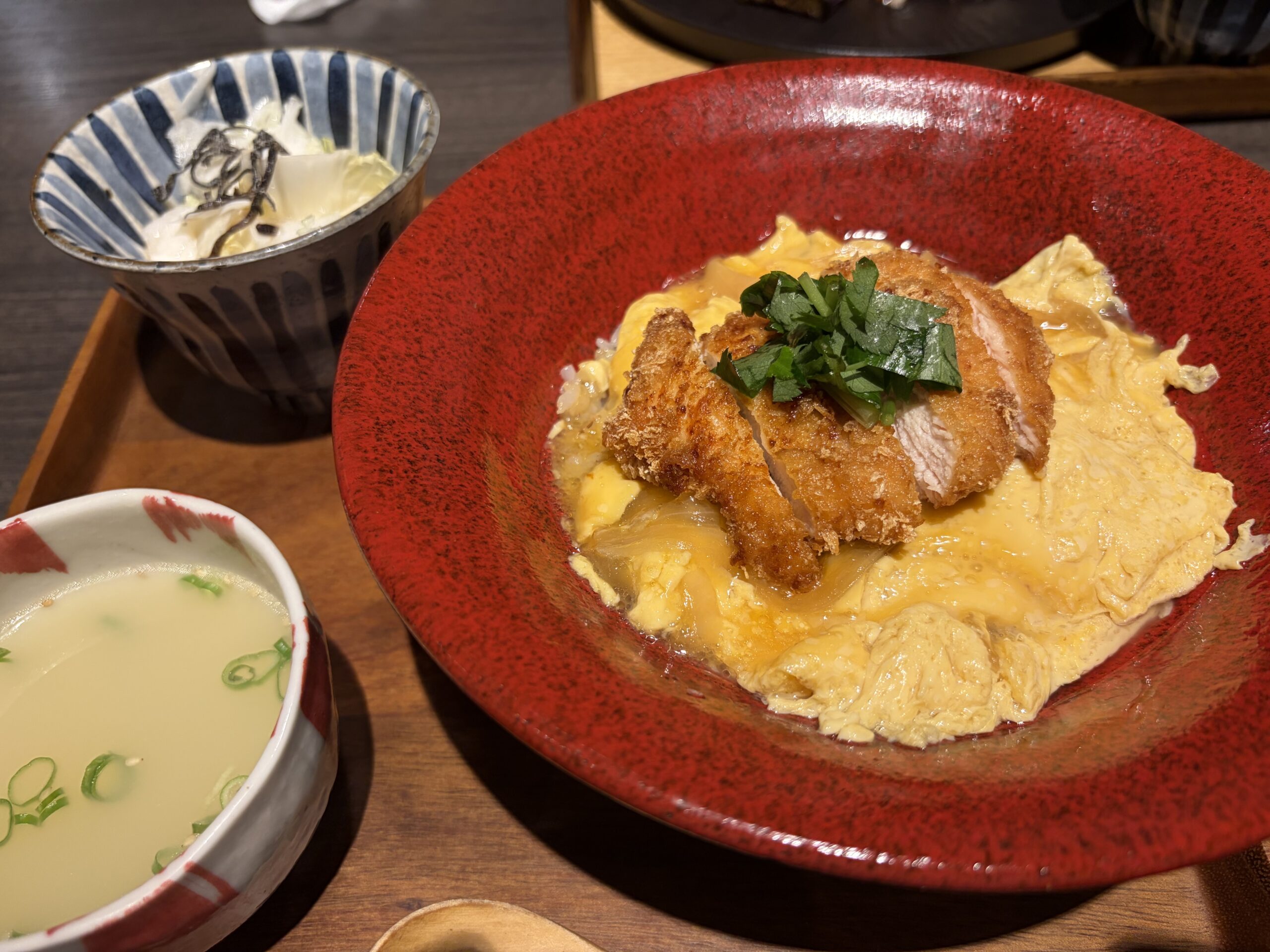 少し遅れて私が注文したチキンカツ丼が運ばれてきました。こちらはスープと白菜サラダが付いています。