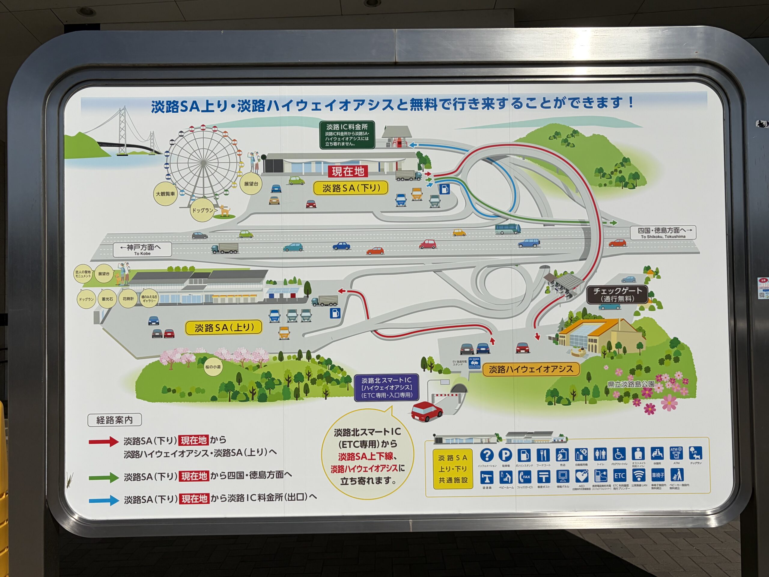 西宮から帰る途中、上りのSAで食事をしている時に家内が下りのSAの観覧車に乗ってみたいと言っていたことを思い出したので淡路SA下りで休憩することにしました。
