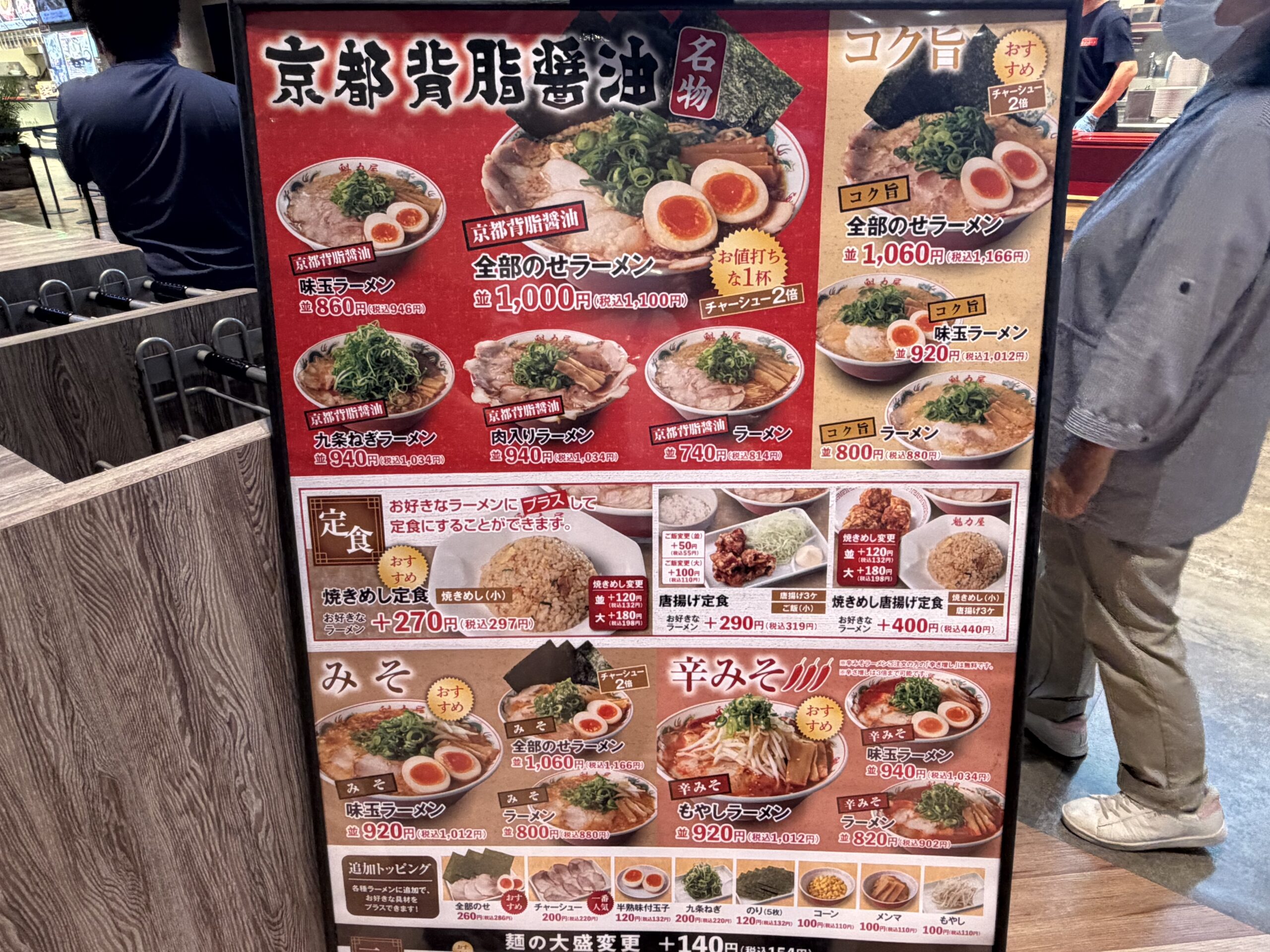 「コク旨」と書かれた方はコッテリしているような気がするので、「京都背脂醤油」を選択しました。家内は「京都背脂醤油 ラーメン」、私は「京都背脂醤油 九条ねぎラーメン」の「焼きめし定食」を注文。