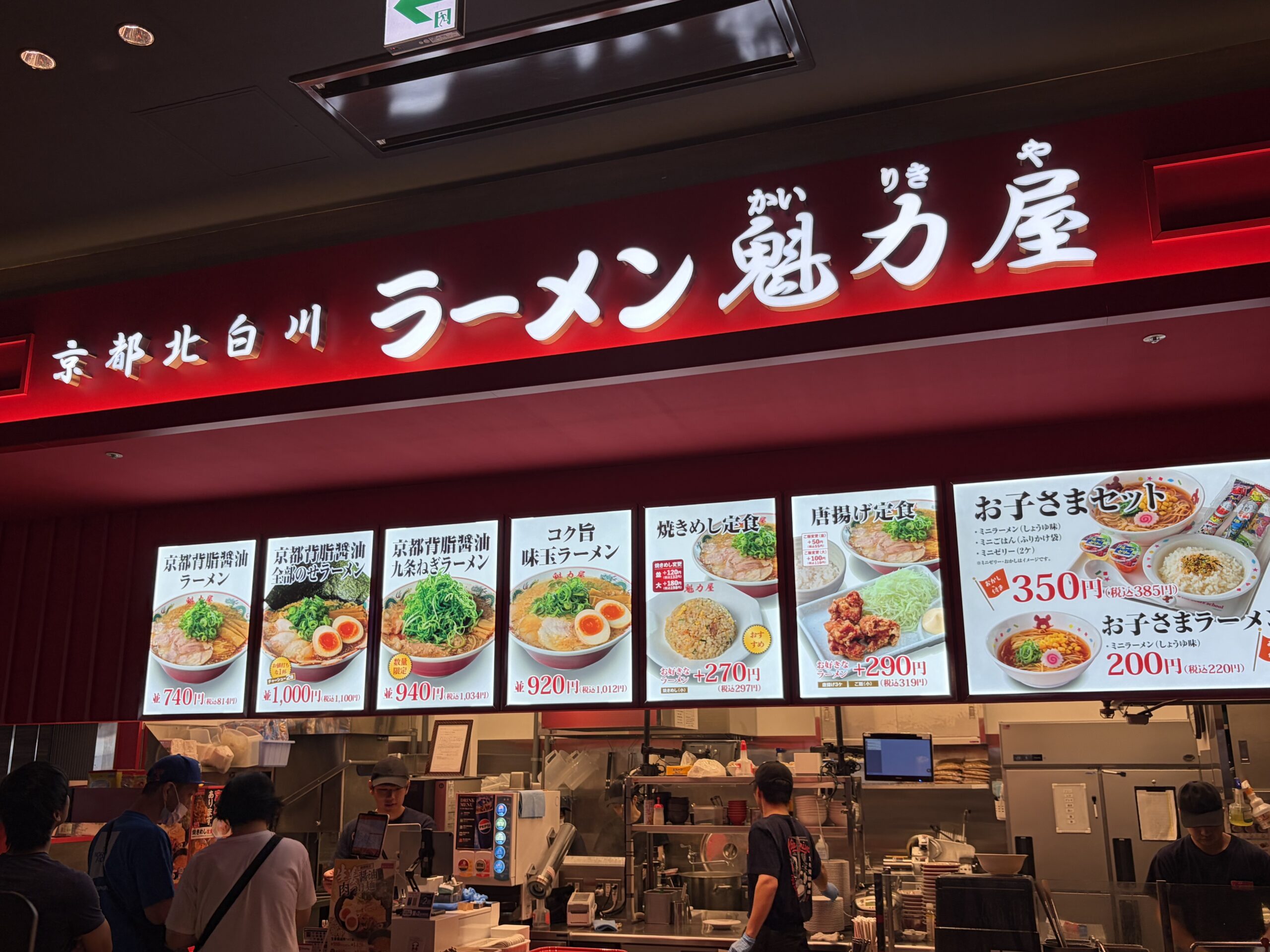 イオンシネマで映画を観る前に腹拵えをすることにしました。定番の店にしようか迷ったのですが、平日11時という時間からかお客さまが少なかったので初めてイオンモールのフードコートでお昼をいただくことにしました。家内が何でも良いというので以前から気になっていた「京都北白川 ラーメン 魁力屋」へ。