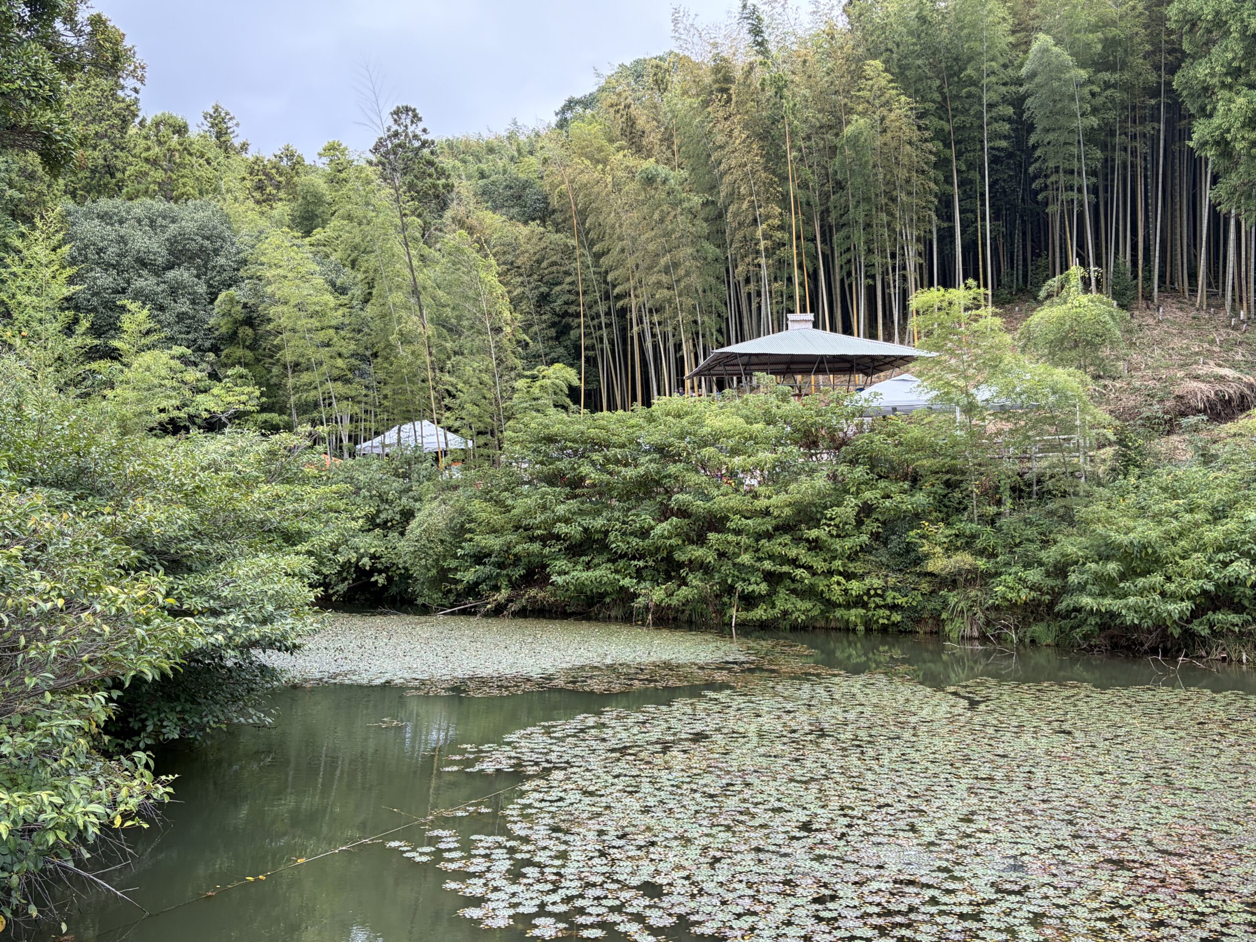 会場手前の池越しに見た会場。本当に竹林の中でのライブです。