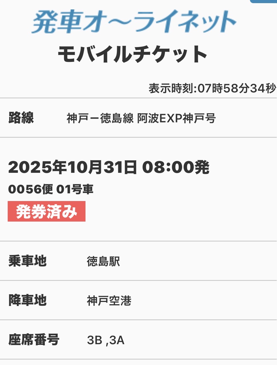 自宅近くのバス停を7:00に出発して7:34に徳島駅に着く予定だったバスが、出発が5分遅れて雨で車が多いのか徳島駅到着が20分遅れの7:54になりましたが、小走りに高速バス乗り場に移動して辛うじて8:00の高速バス発車時刻の3分前に乗車することができました。