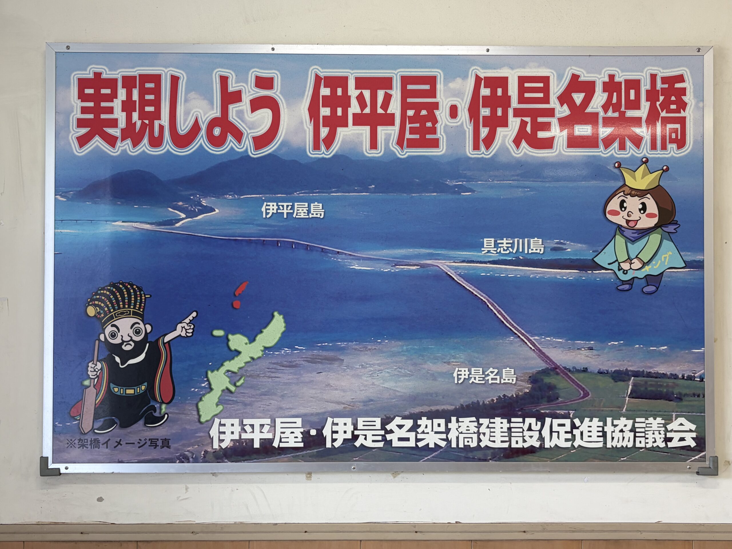 伊平屋島と伊是名島を橋で結ぶ活動もしているそうです。伊是名島の北にある具志川島まで橋を架け、具志川島から分岐するような形で伊是名島まで橋を延ばすのだそう。今はそれぞれの島に行くには運天港で別のフェリーに乗らなければなりませんが、橋が繋がれば船の運航も効率化されるでしょう。今日も伊平屋島行きの一便はエンジントラブルで欠航になっていて伊平屋島に行こうとしているお客さまは困っていました。