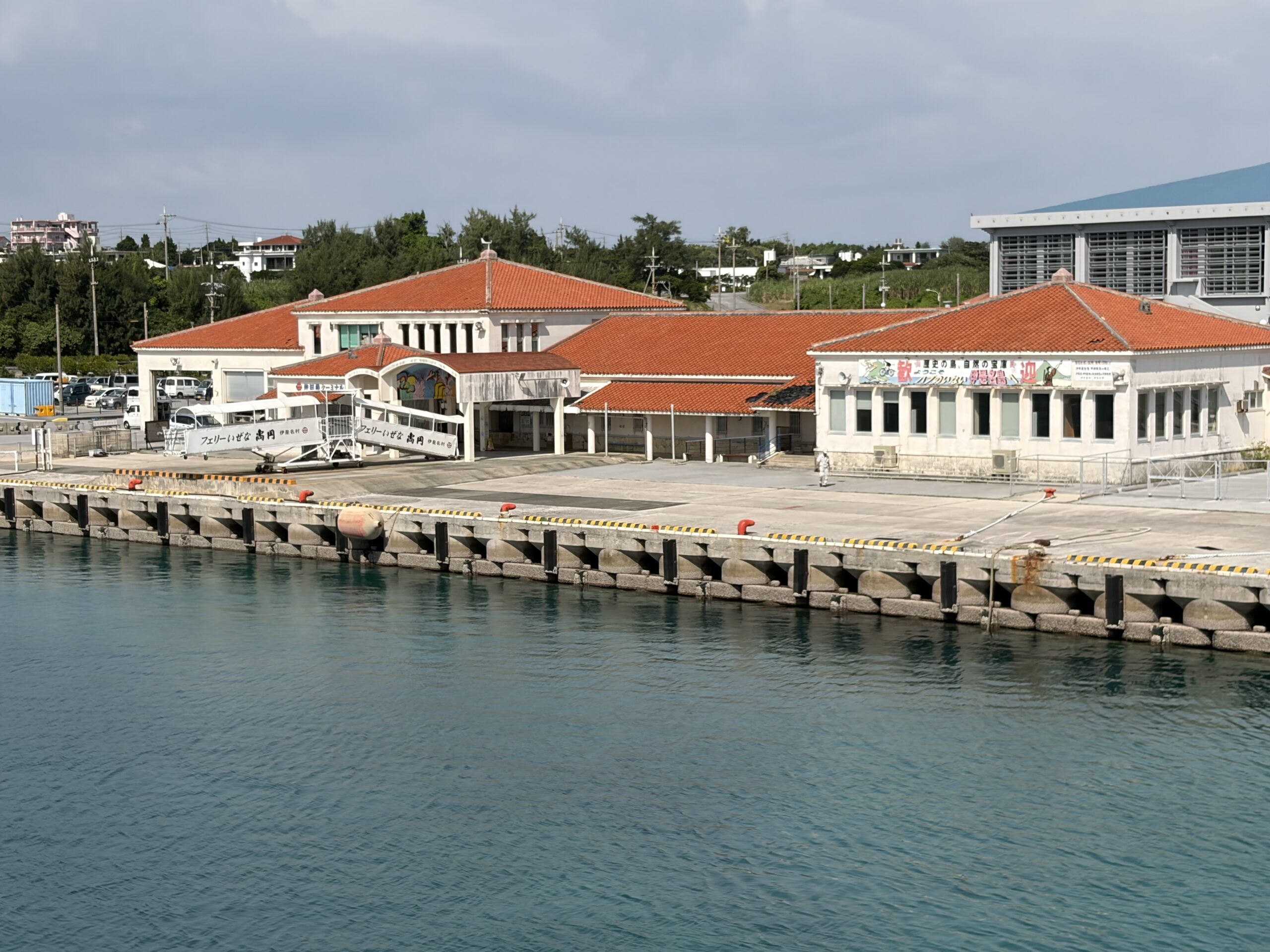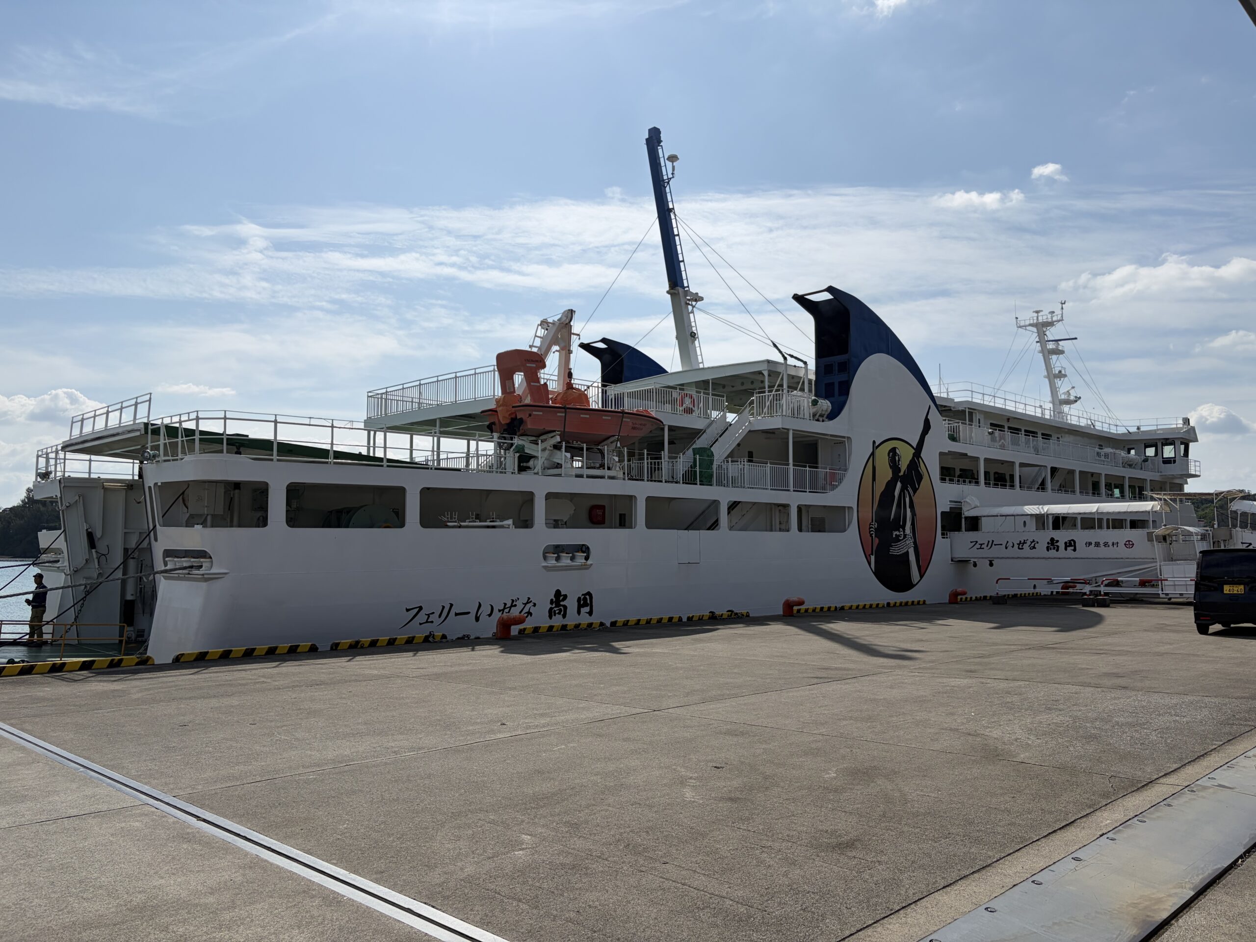 フェリーが到着しました。船腹に「フェリーいぜな 尚円」の文字が見えます。真ん中には第二尚氏の始祖である金丸の絵が描かれていました。