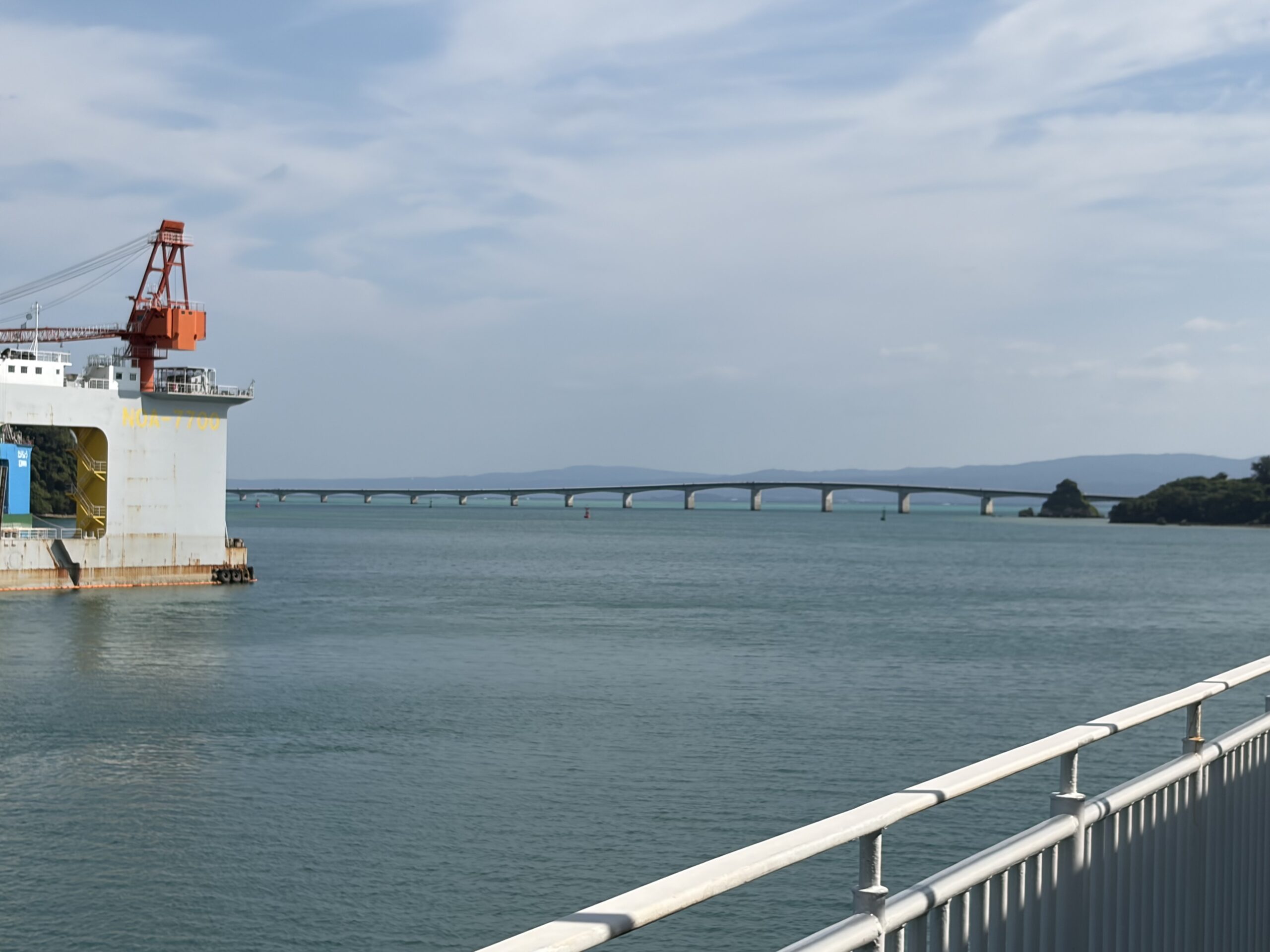 いよいよ出港です。運天港の出口に差しかかると古宇利大橋が見えてきました。今年の2月に今帰仁側の橋のたもとから運天港に入ろうとするフェリーを見たことを思い出しました。