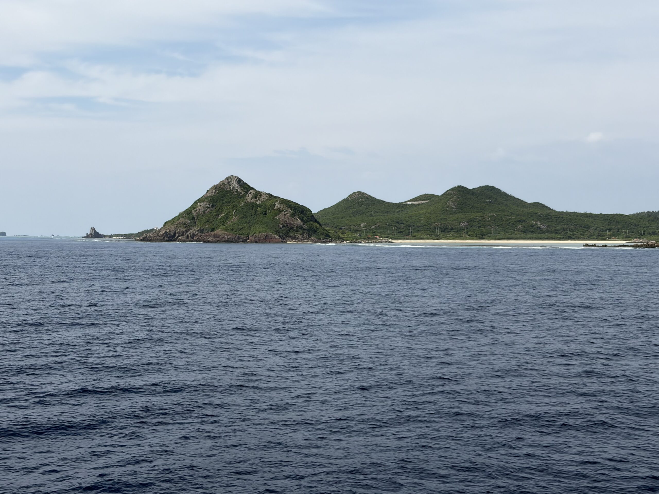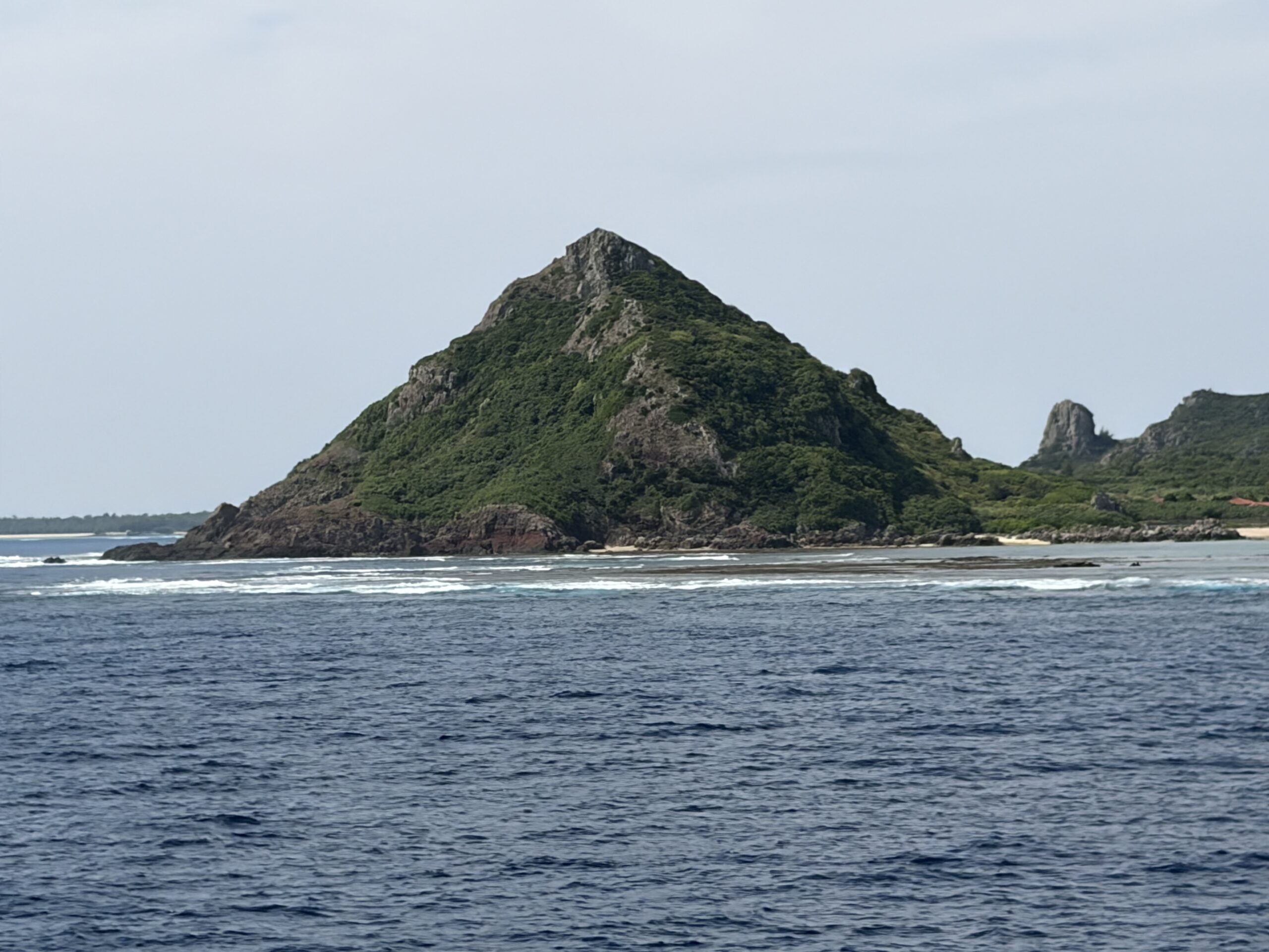 伊是名島の仲田港に近づいてきました。進行方向左側には三角形の山が見えてきました。伊是名城が築かれた山だそうです。その右側には比較的緩やかな山が連なっています。