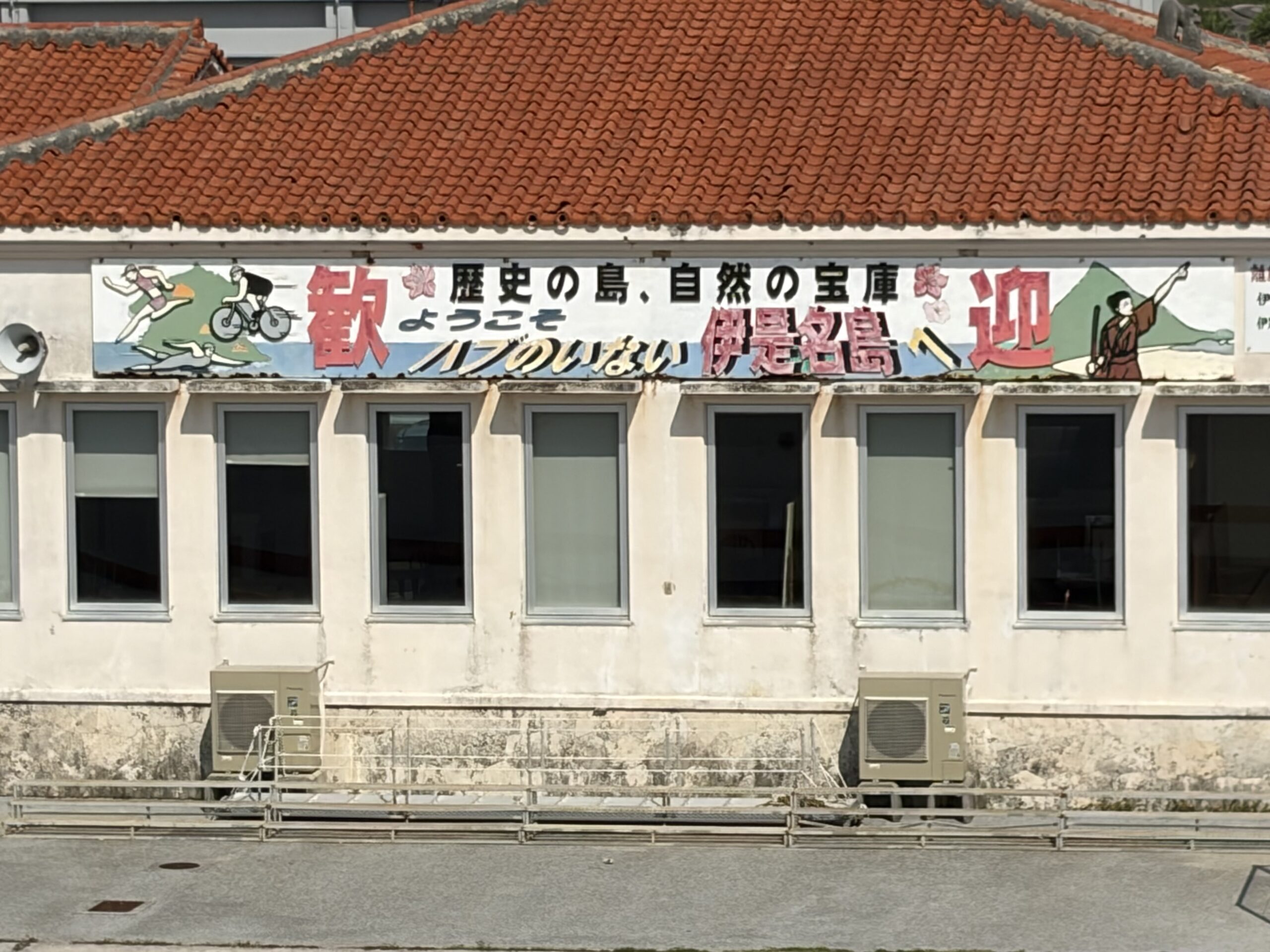 いよいよ伊是名島上陸です。ターミナルの中の壁に島出身の名嘉睦稔氏が製作した「島の星」と題された陶板壁画が掲げられていました。ボクネンファンにとっては何よりの出迎えでしょう。