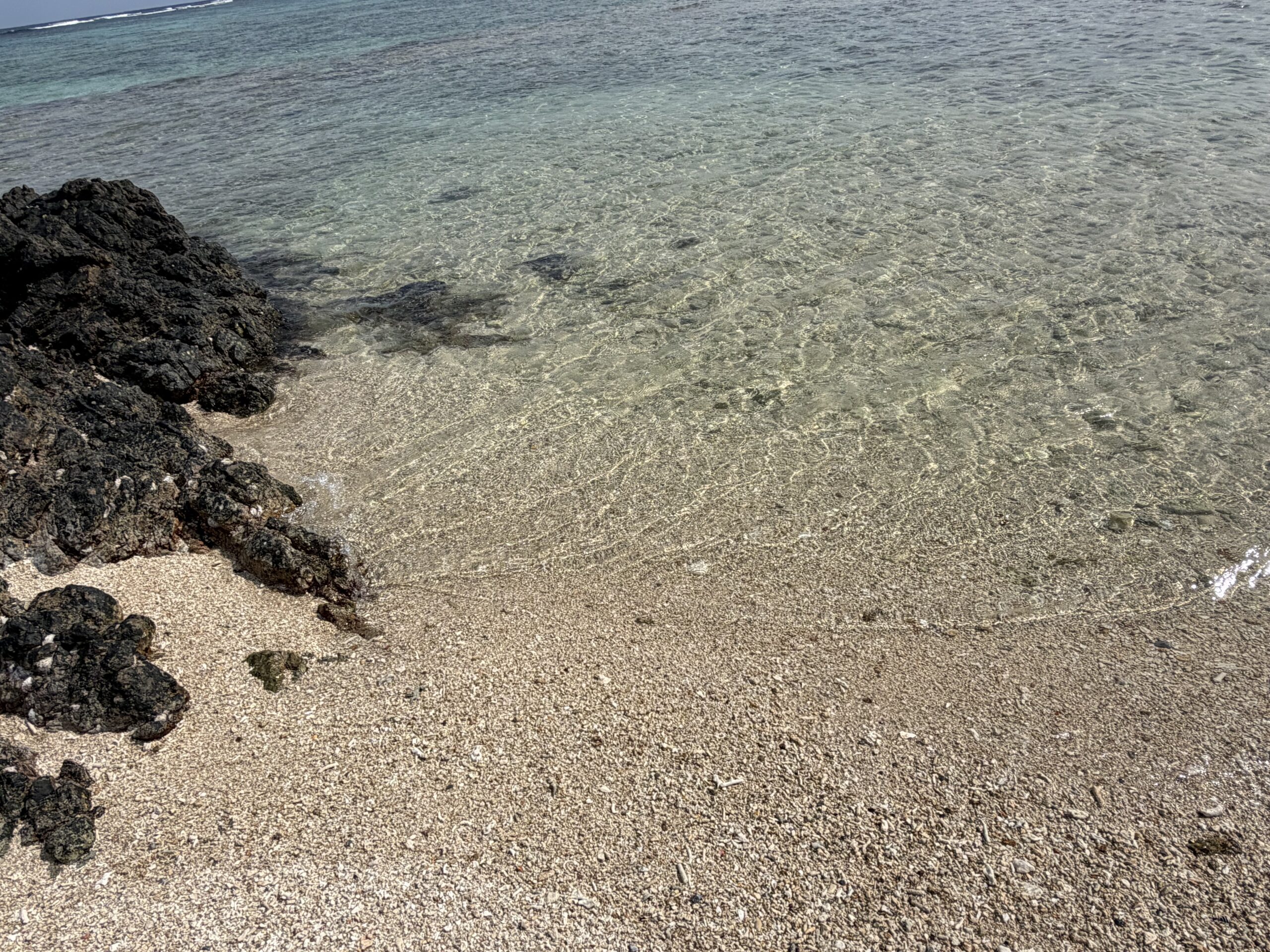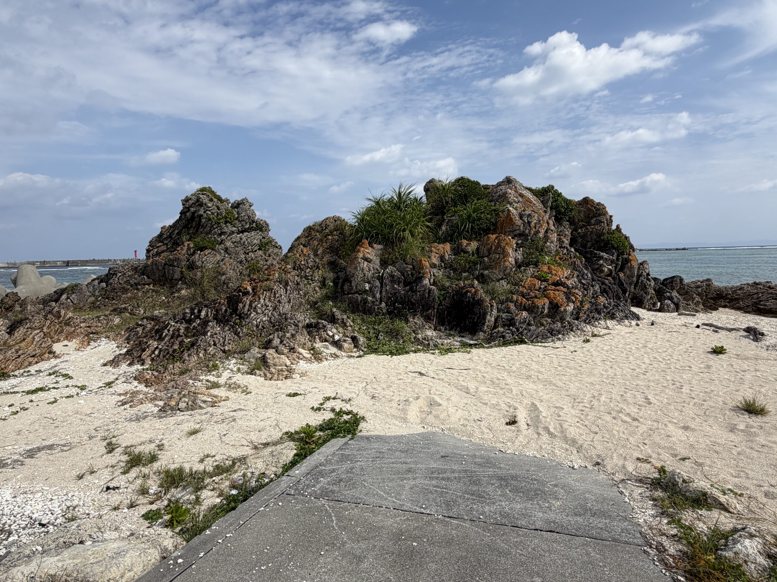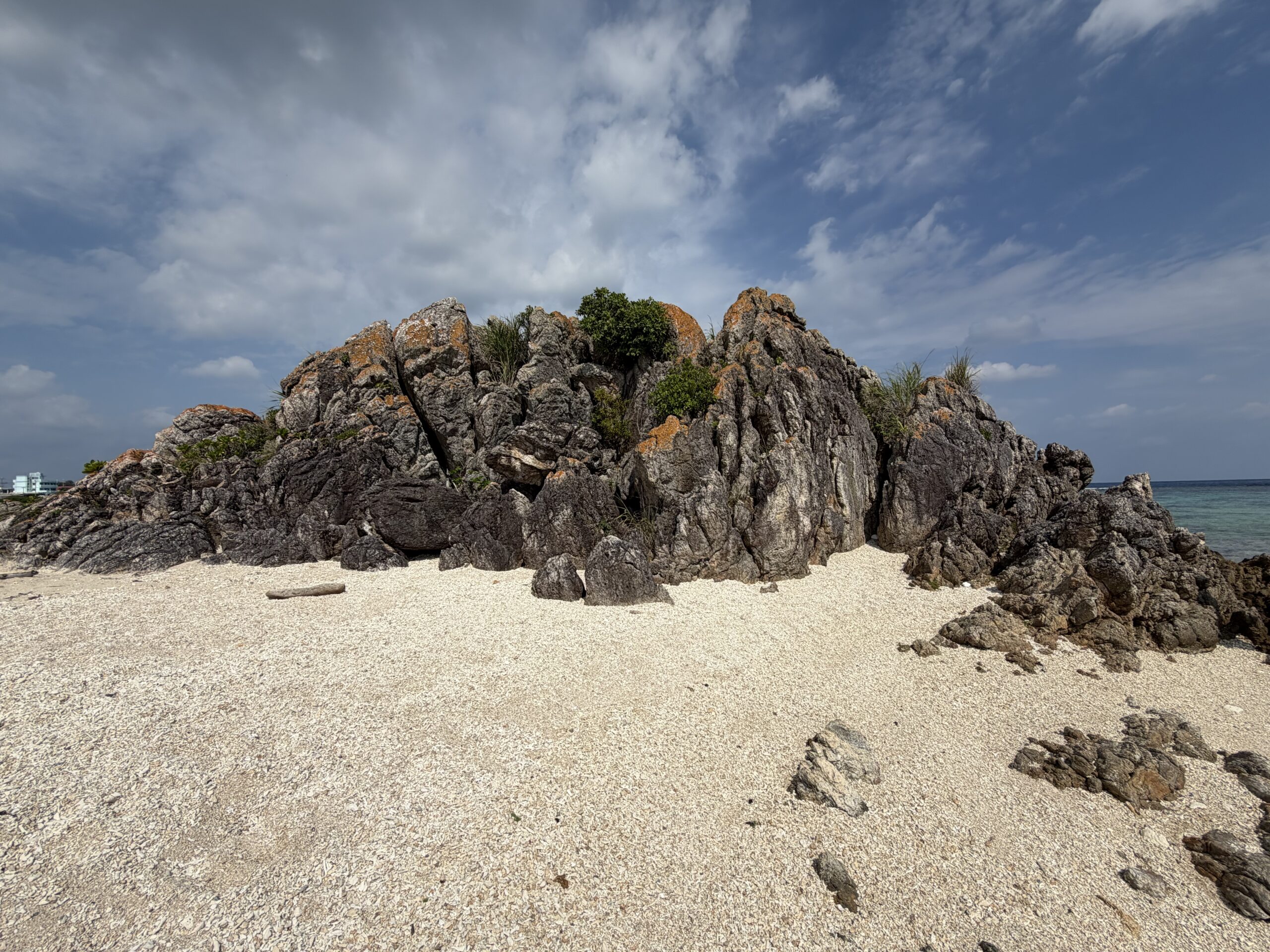浜に降りると大きな岩の塊がありました。ところどころ赤くなっています。琉球石灰岩ではありませんので沖縄のビーチでは珍しい光景です。
