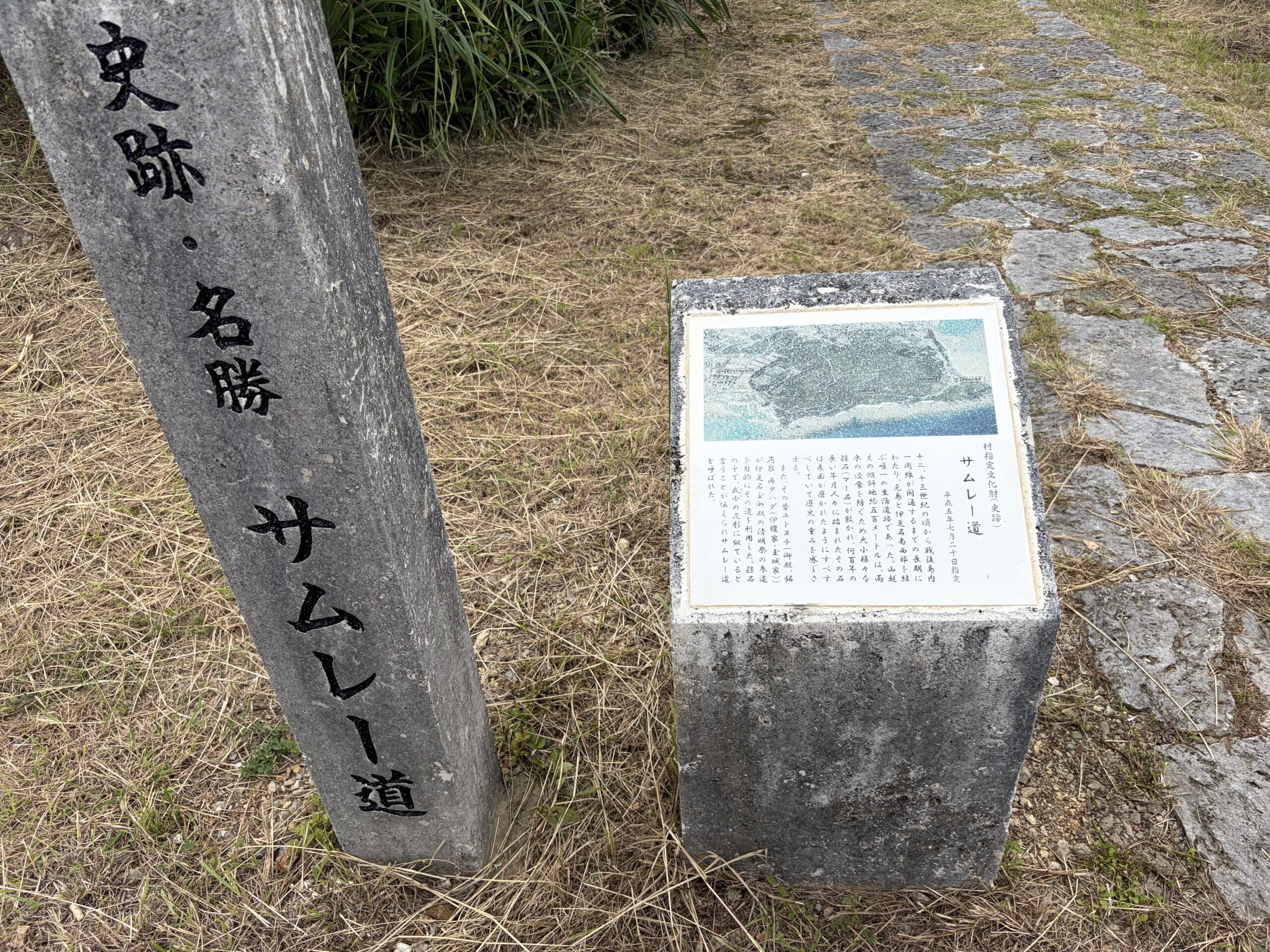 ガイドマップを見るとすぐ近くに「サムレー道」という道があると書かれています。車で走っていると見落としそうな「サムレー道」と彫られた石柱がありました。