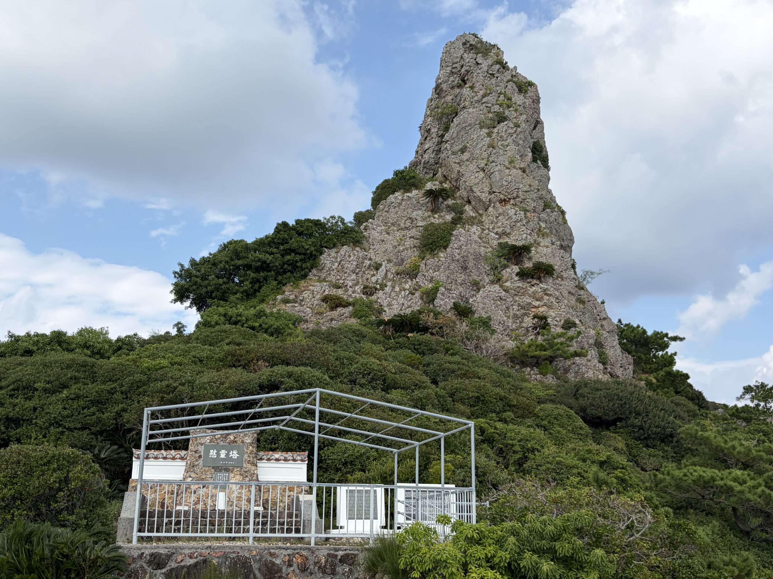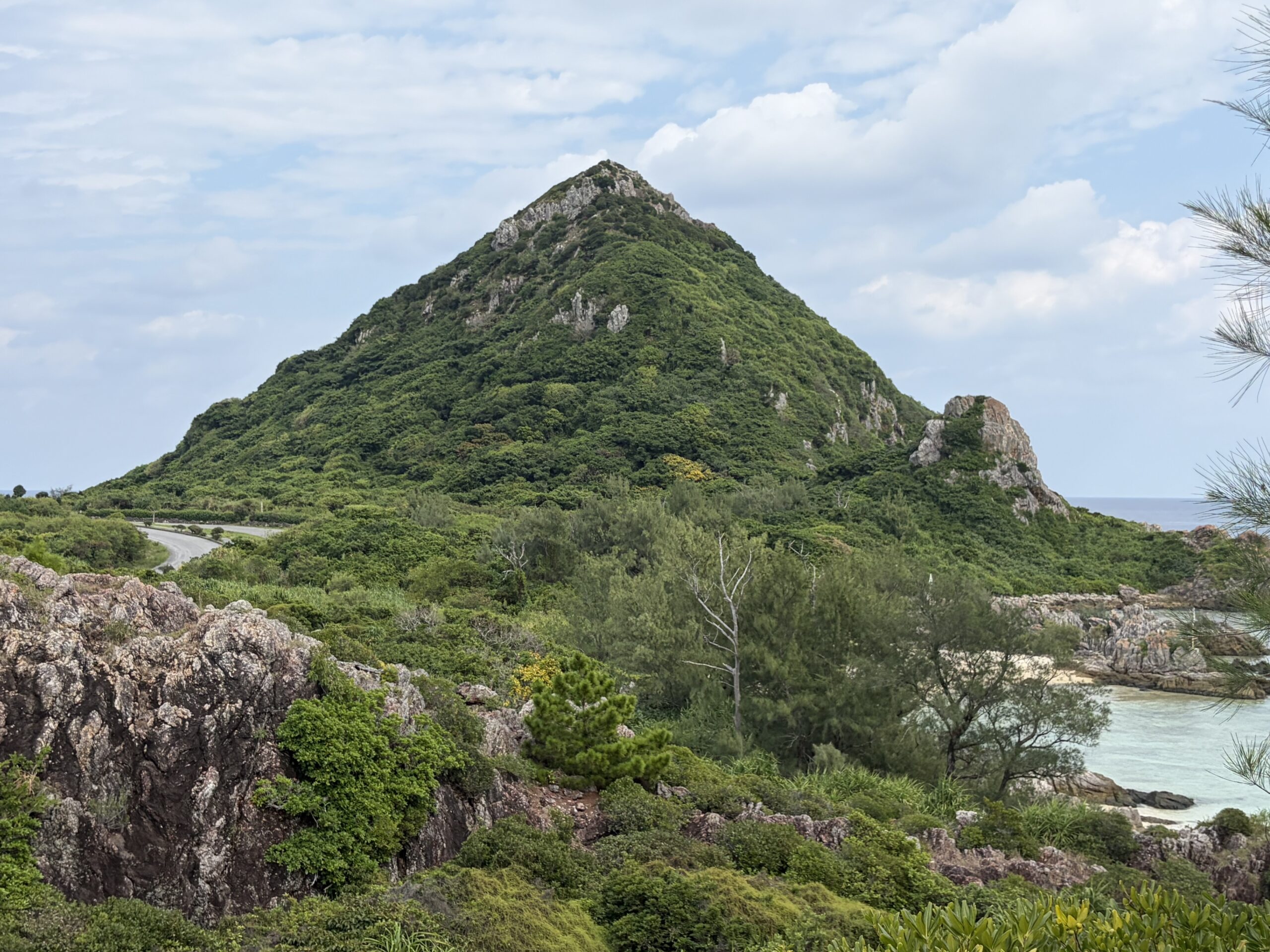 ここから見る伊是名城趾は綺麗な三角形になっています。良く見ると右側に石の柱が立ち上がっています。