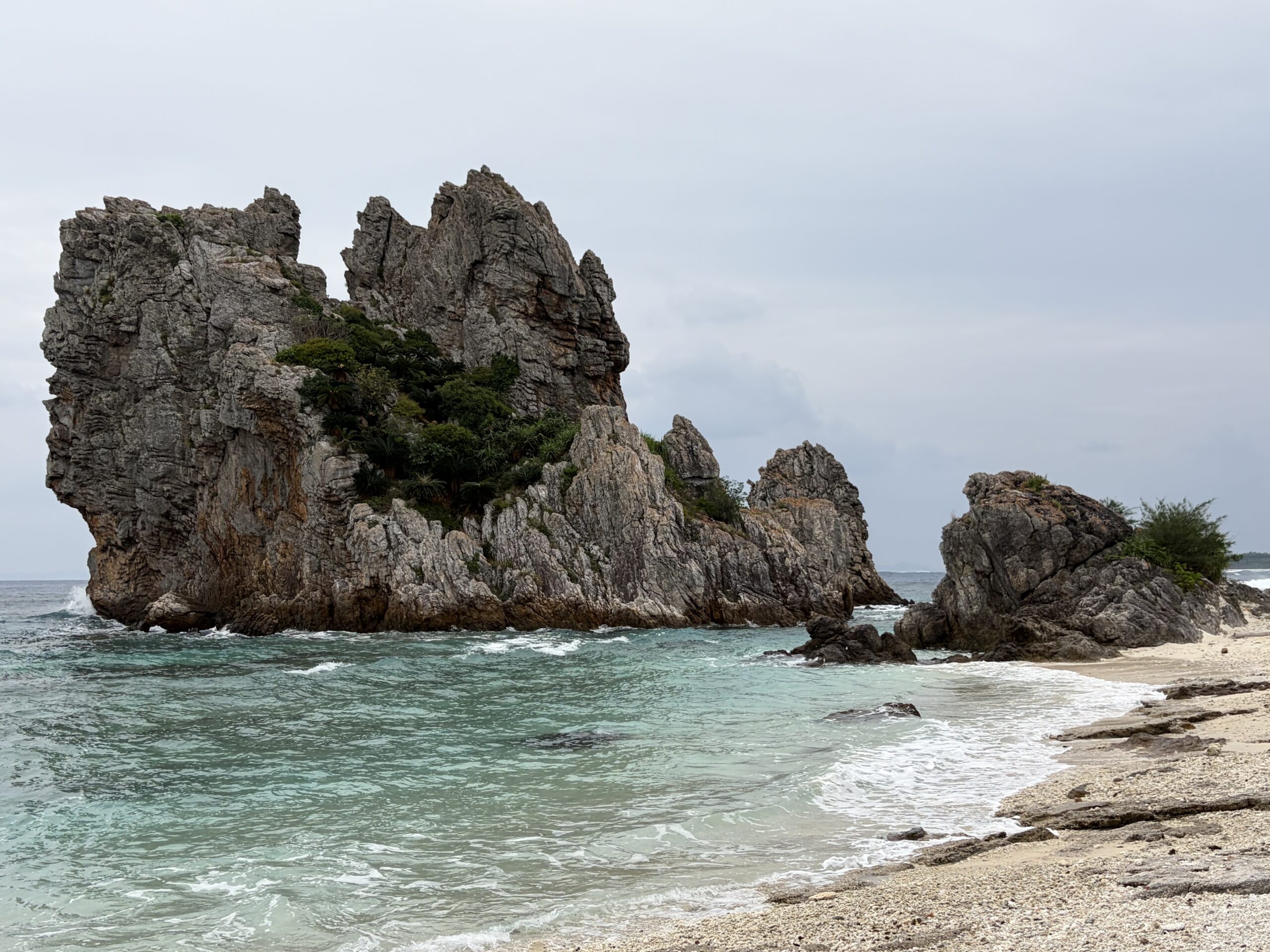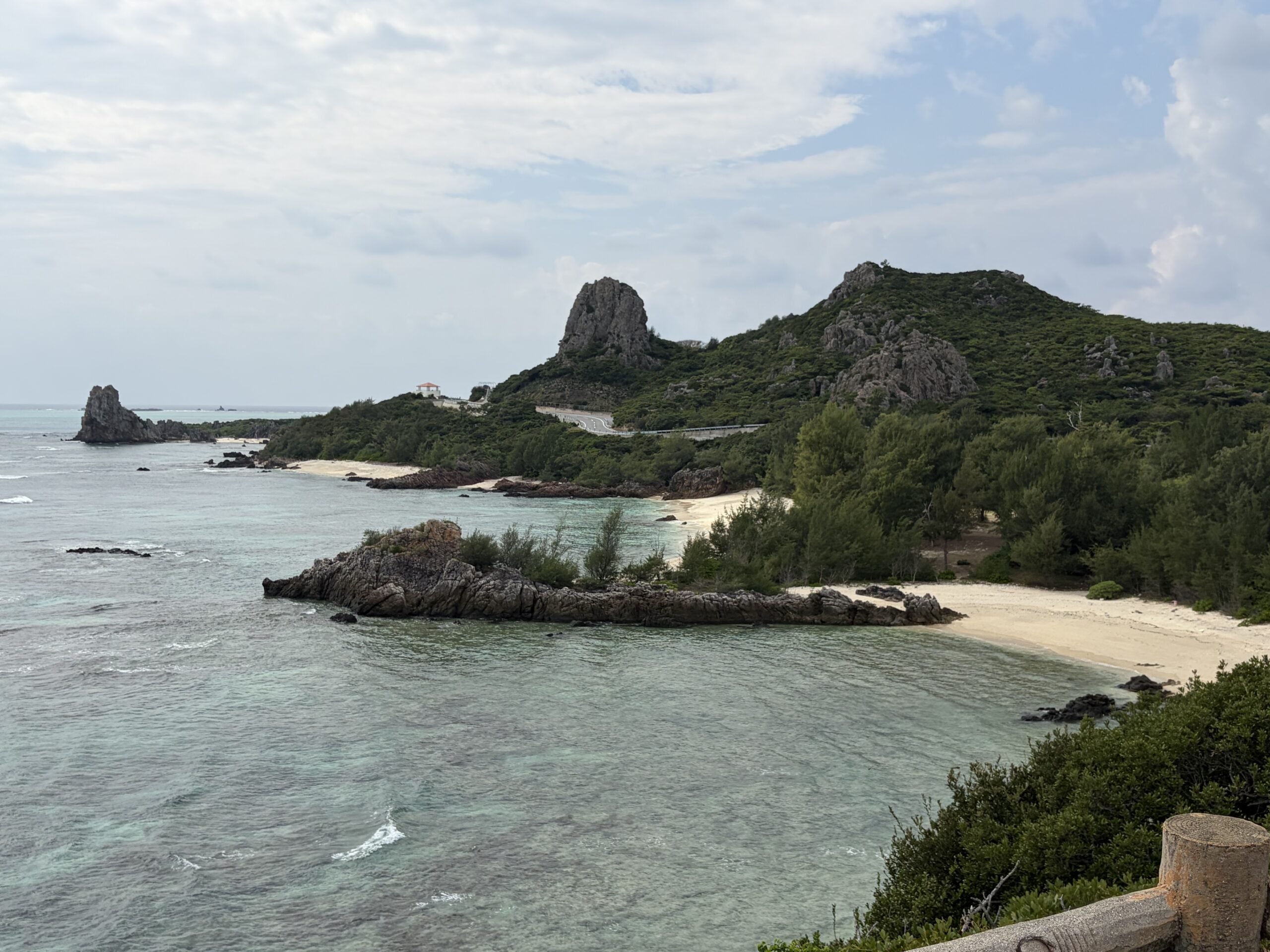 展望台の上まで上がると白い砂浜のビーチのすぐ横にゴツゴツとした岩場があって、その岩が伊是名城趾の岩山に連なっている様子が見てとれます。