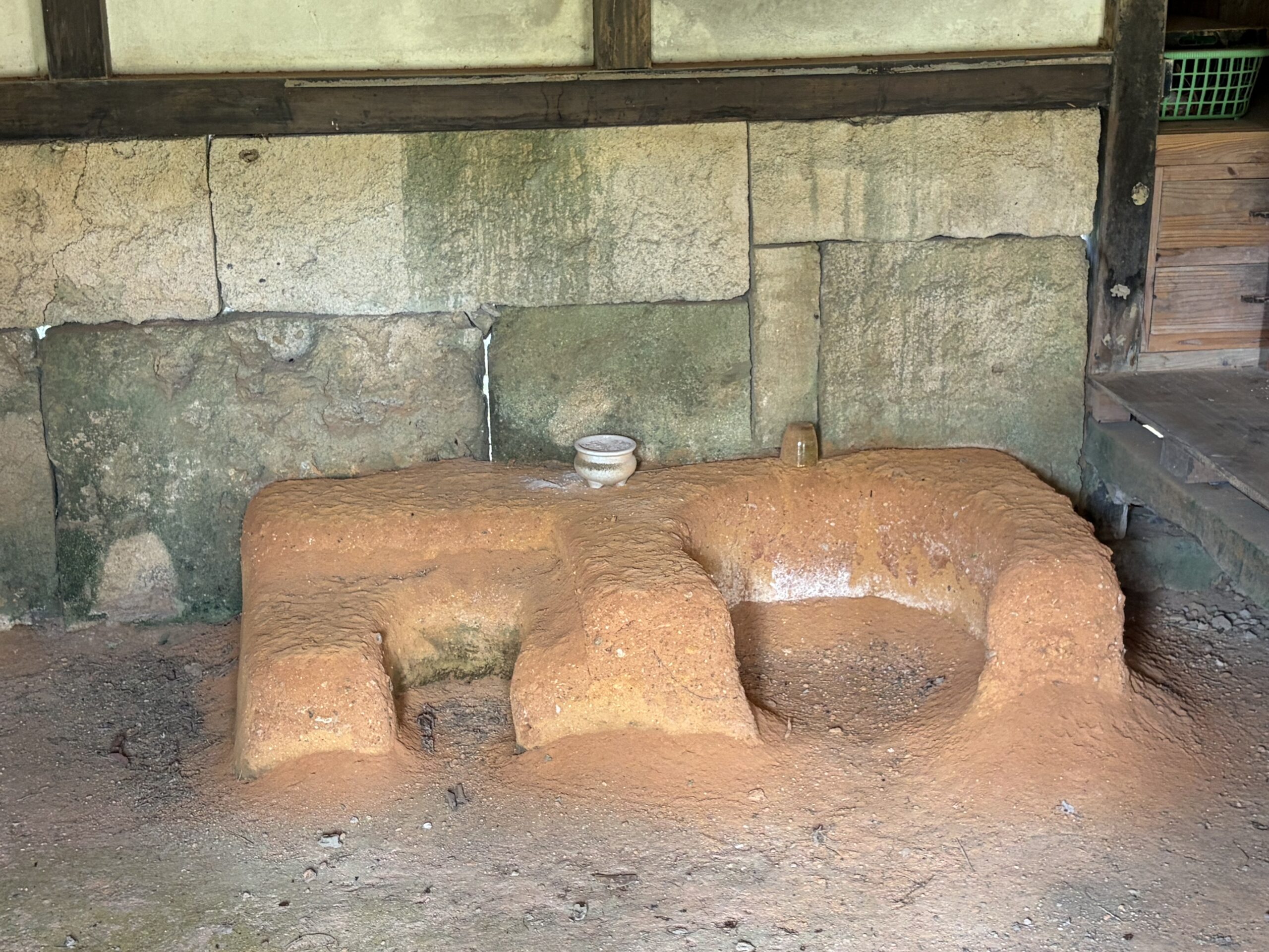 母屋の端にあった台所と思われる土間です。奥に竈があって、防火対策なのか壁は石造りになっています。