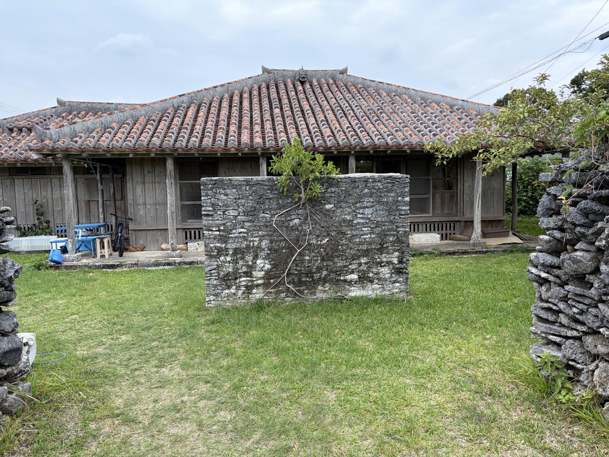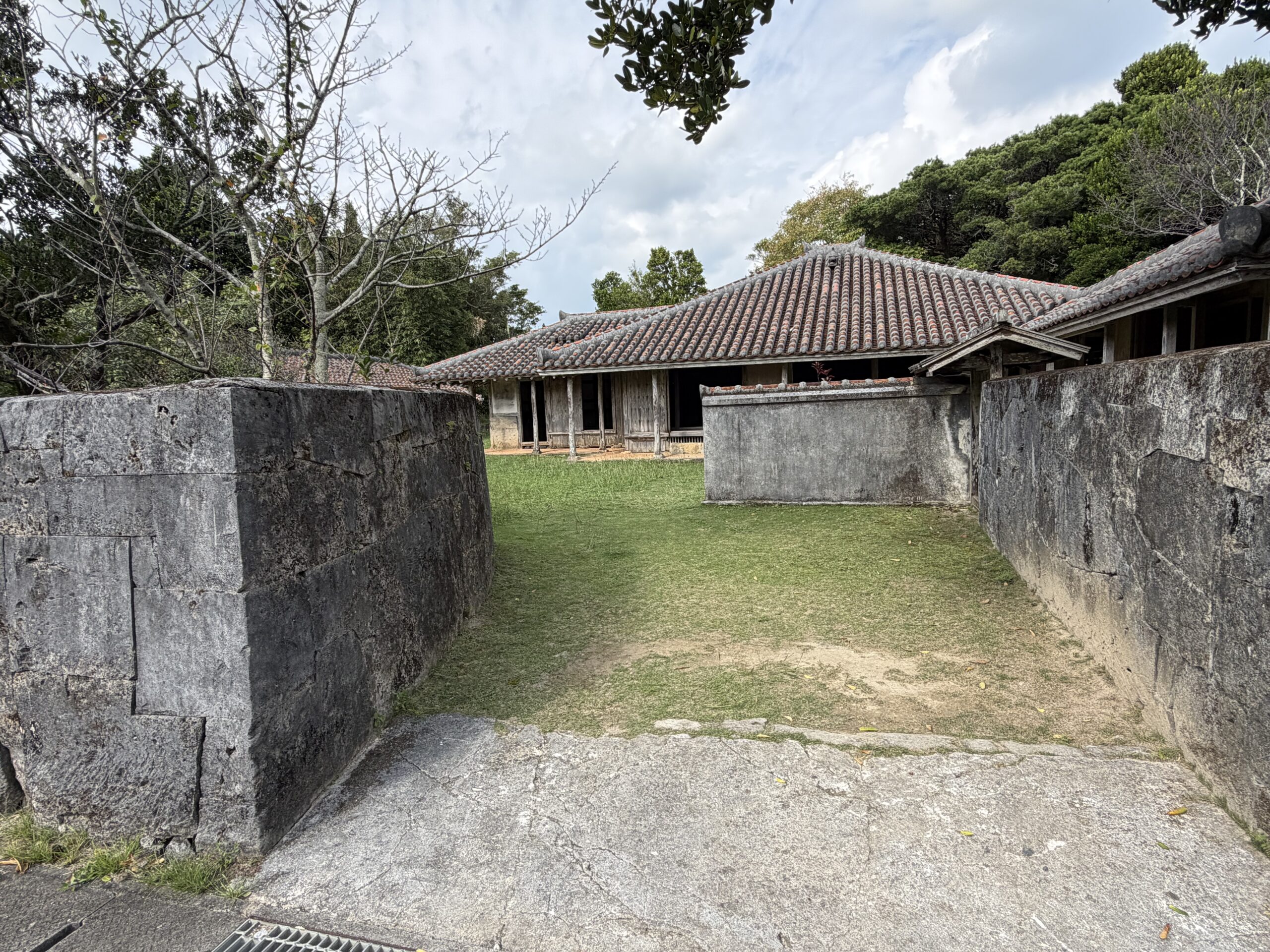 勢理客の集落の中を探し回って旧名城家住宅を見つけました。この住宅は今も使われているようなので敷地には入らずに外から見学させていただきました。後で調べてみると住宅というよりは住宅を囲っている石垣が重要文化財に指定されているようでした。写真に少しだけ写っていますが、琉球石灰岩を野面積みにしたもので角は丸く仕上げられているそうで、伊是名村での伝統的な屋敷構えだそうです。