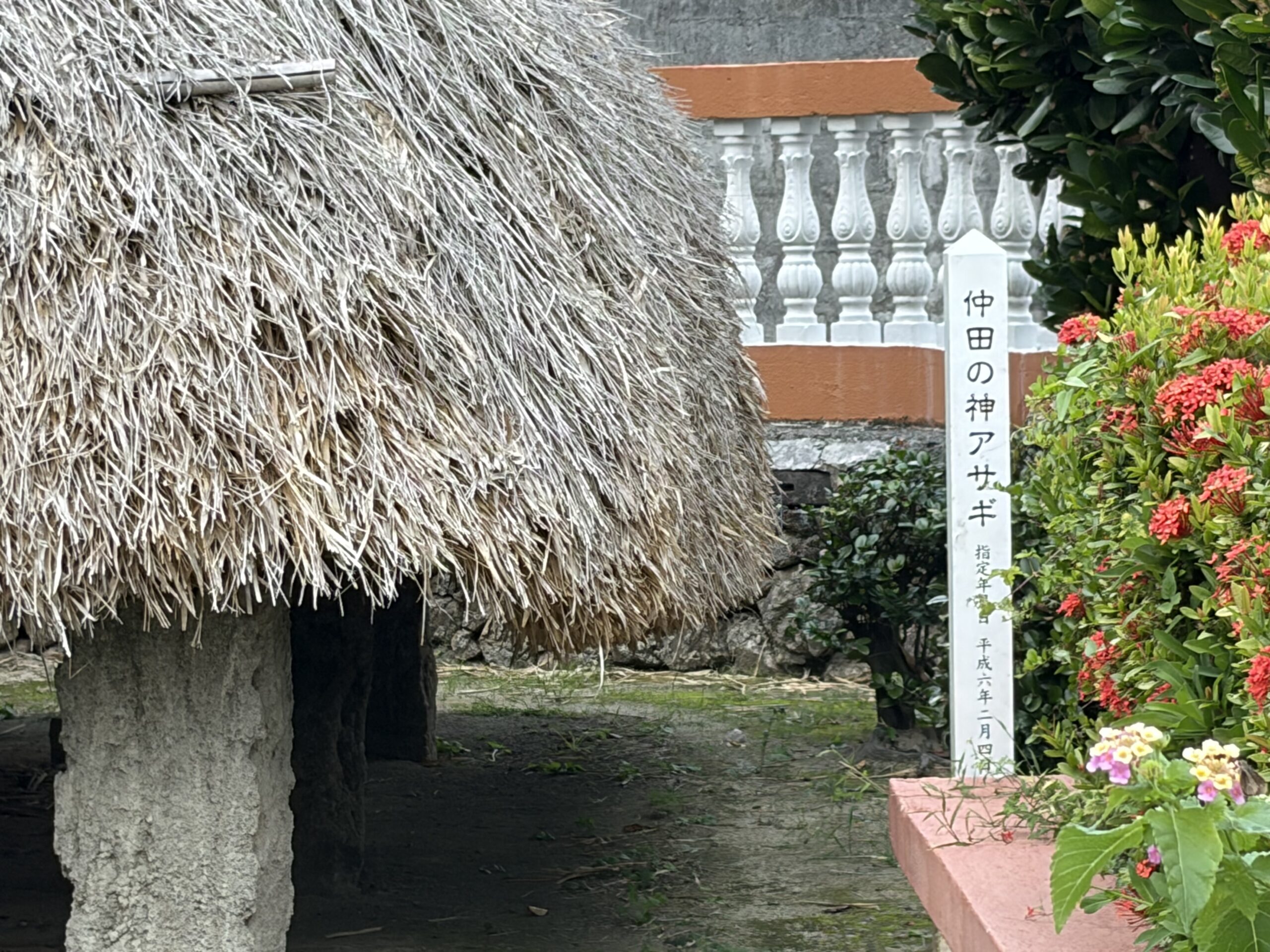 民家のようなので入口から覗き込むと「仲田の神アサギ」と書かれた標識が建っていました。「アサギ」とは集落の守護神が祀られている所で、神女達が御嶽へ遙拝したり、神歌を謡ったり、神酒のふるまいを受けたりする場所だそうです。