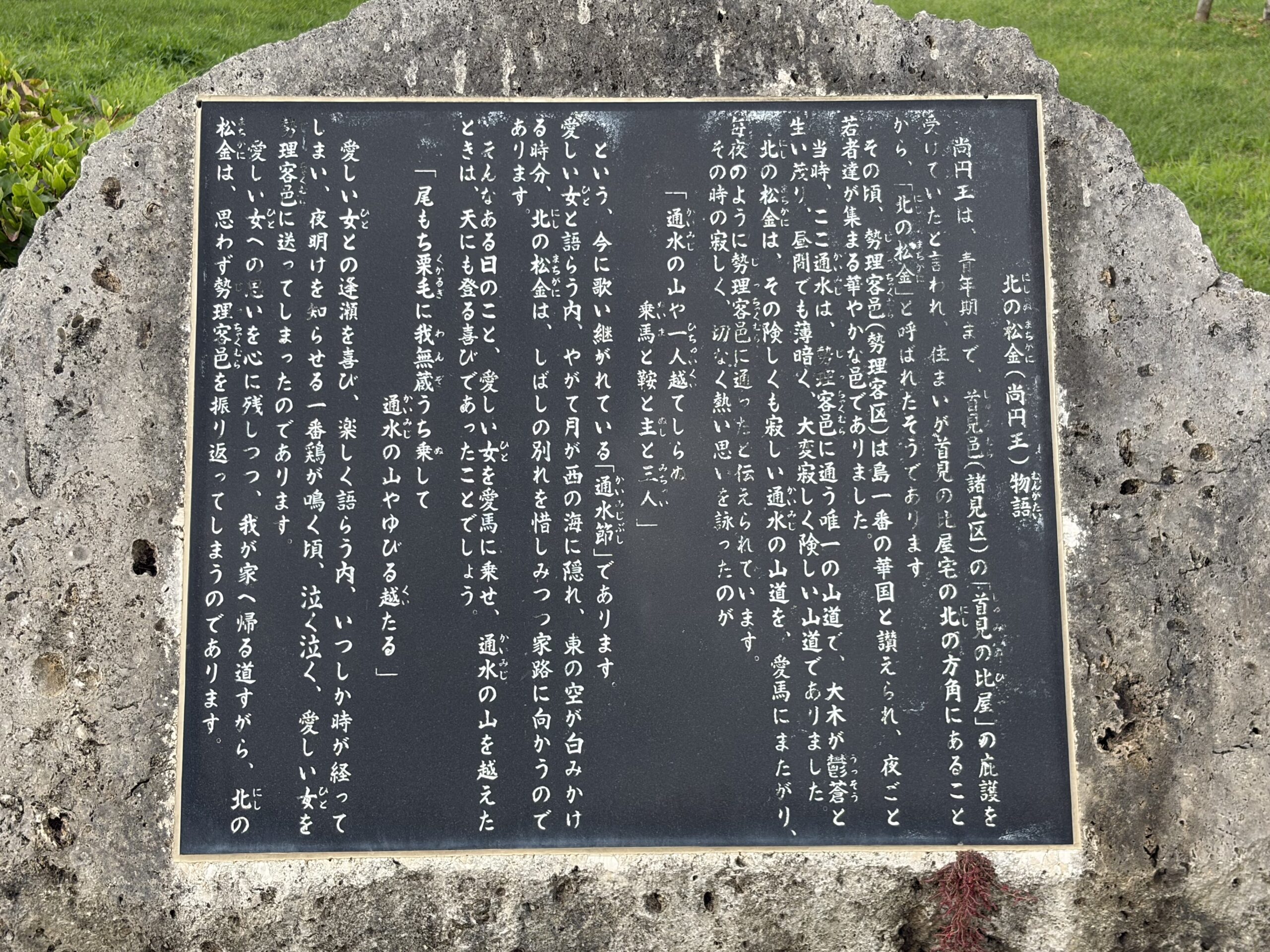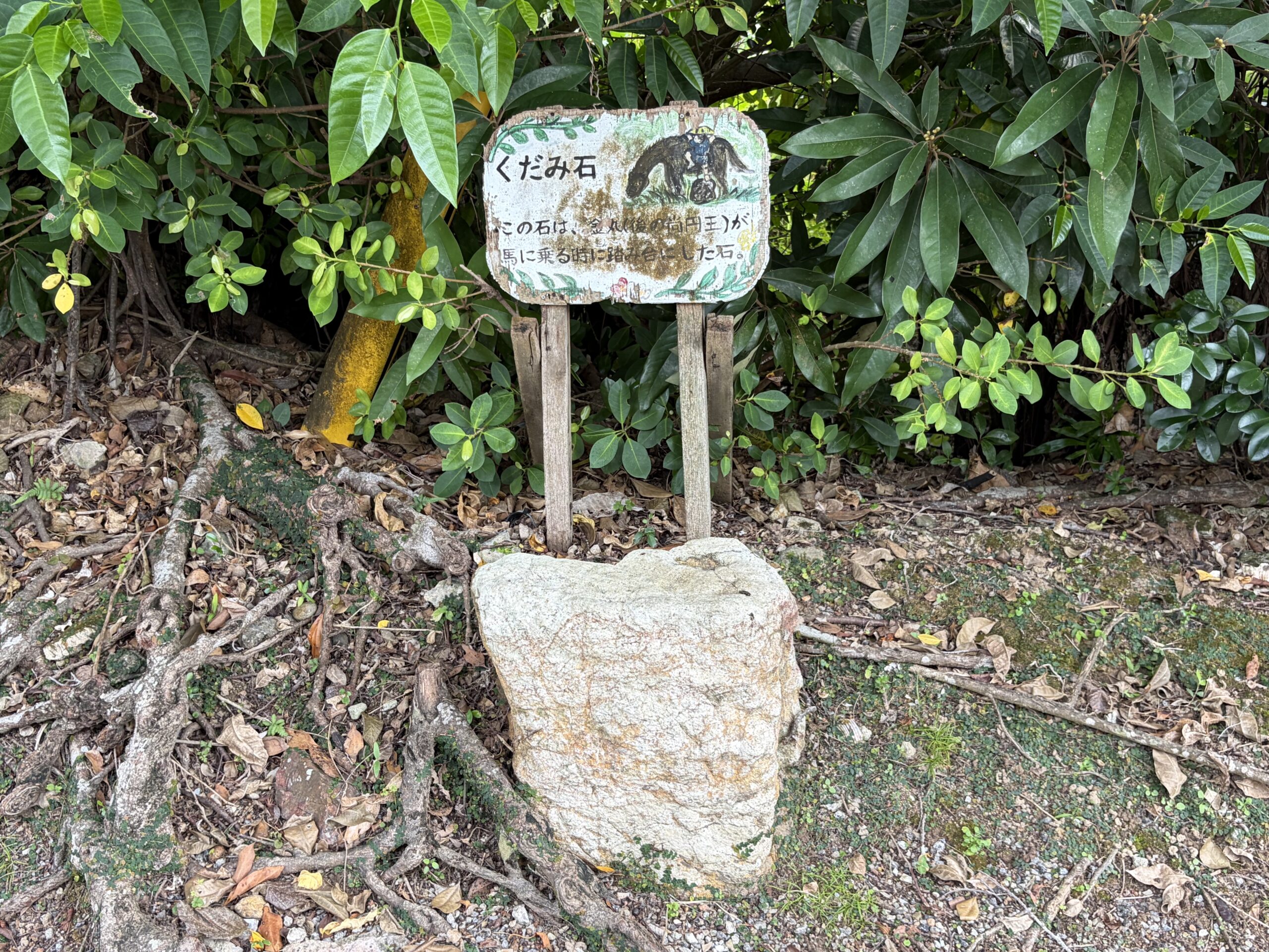 公園を出たところに「くだみ石」という石がありました。解説によると金丸(尚円王)が馬に乗る時に踏み台にした石とのこと。確かに踏み台になりそうです。勢理客にいる恋人に会いに行く時も使ったのでしょうか。