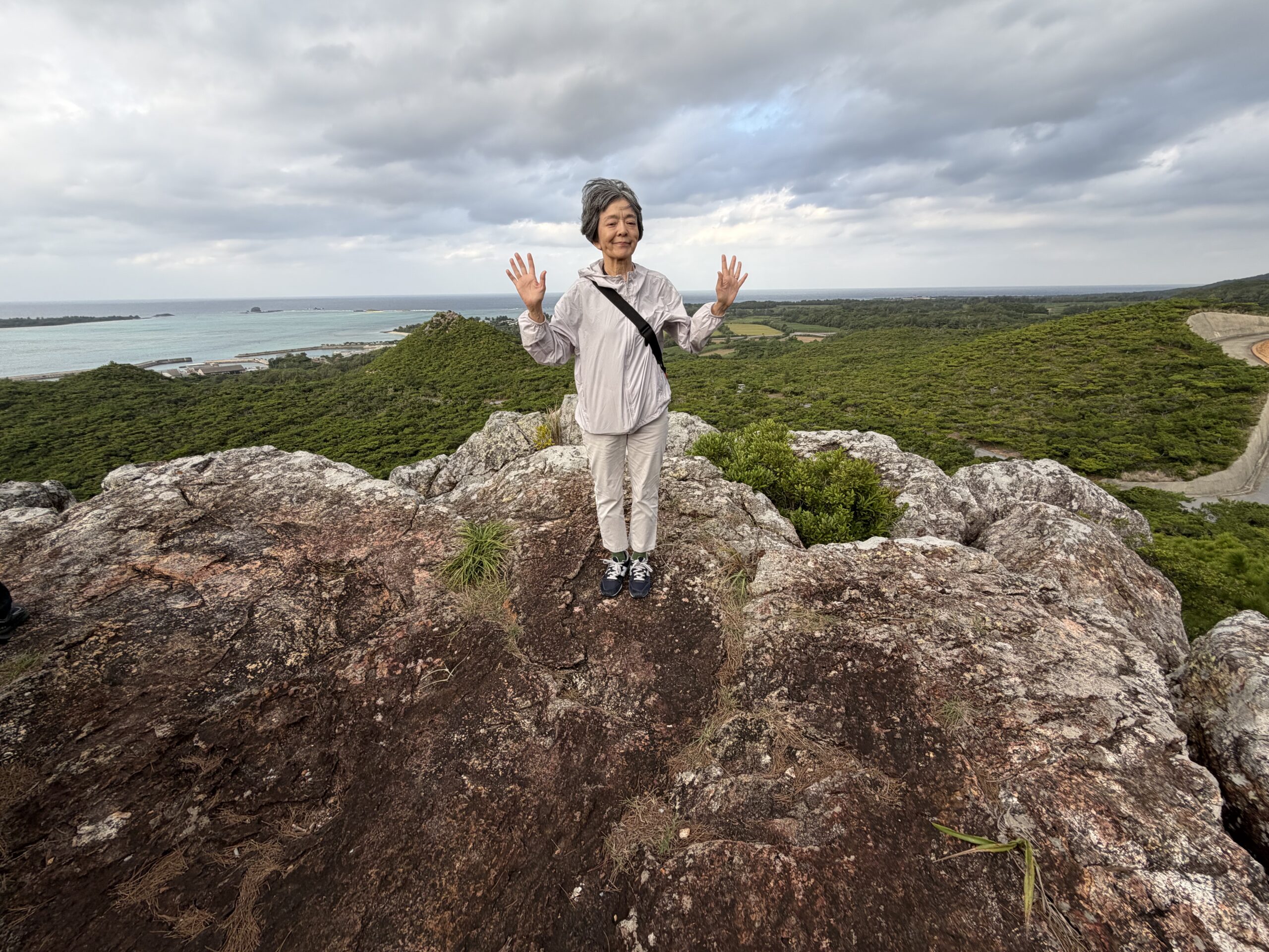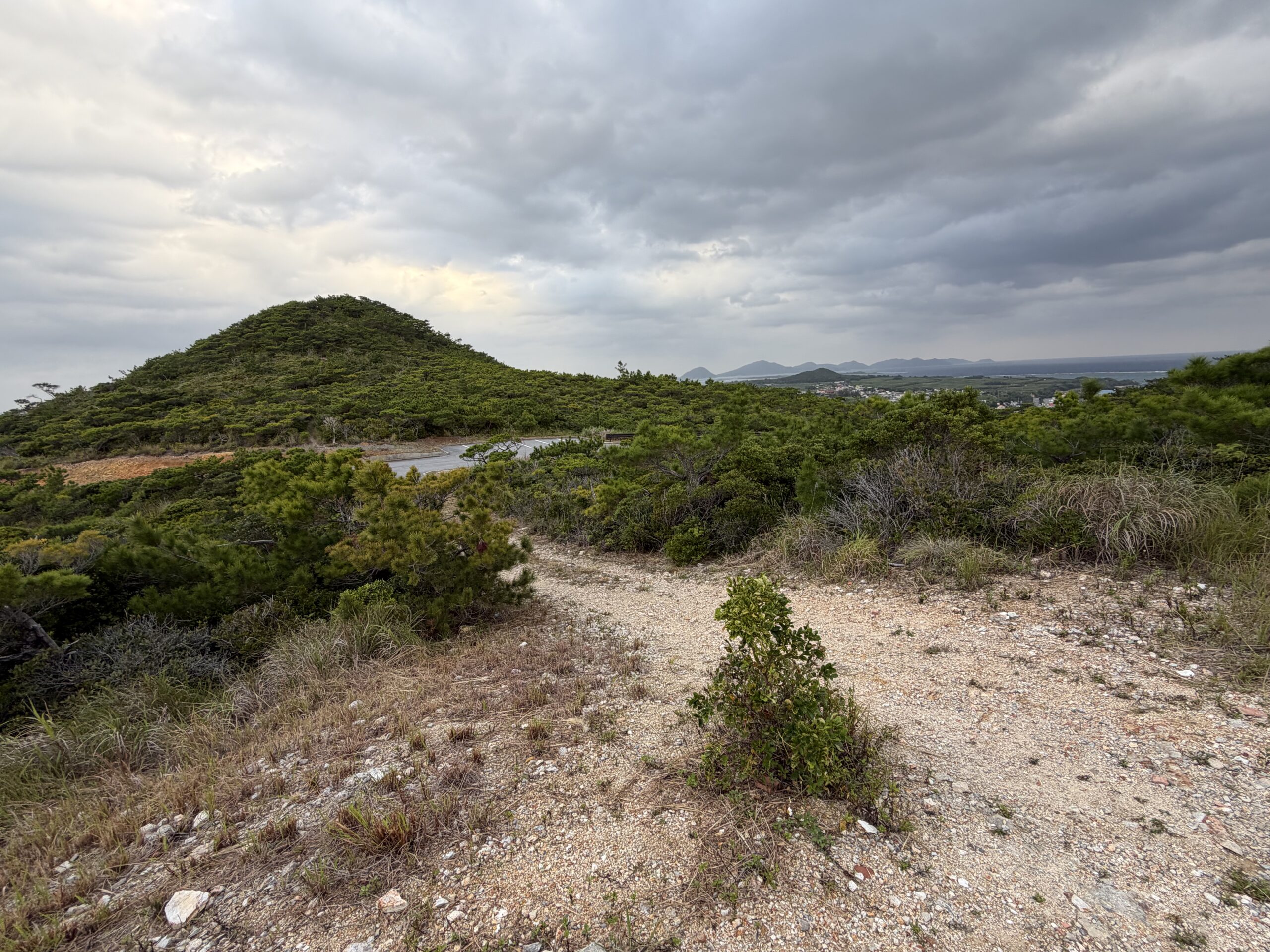 Googleマップを頼りに「神の岩座」を目指しました。近くまで来ているのに昨日の「逆田」のように道が見つかりません。ポイントと思われる場所の少し先に駐車場があったので、車を駐車場に停めて歩いてみることにしました。すると逆方向ではあるものの登りの階段がありました。伊是名森林公園展望台に向かう階段の可能性があるので登ってみることにしました。しばらく登っていくと開けたところに行きつきました。