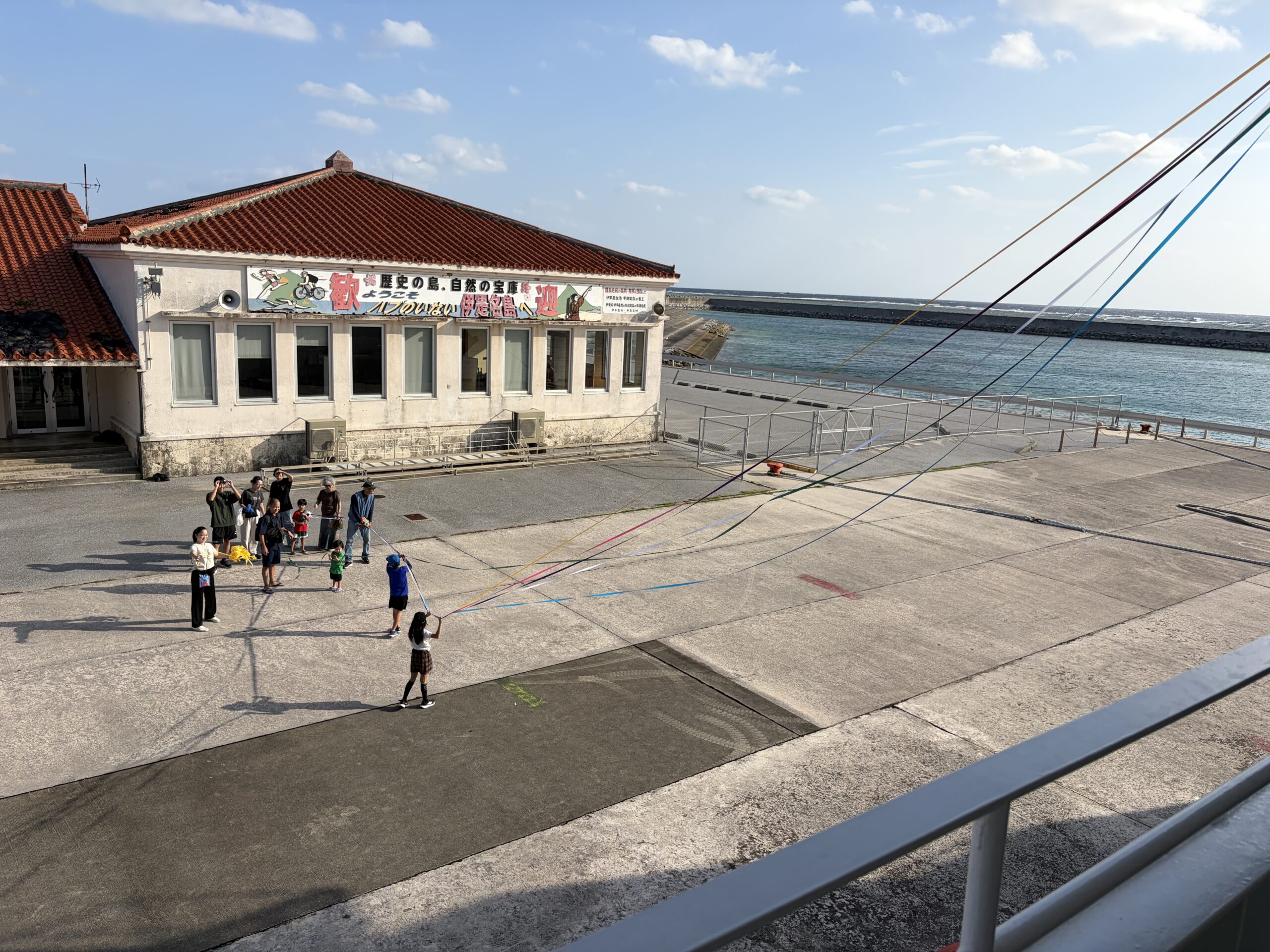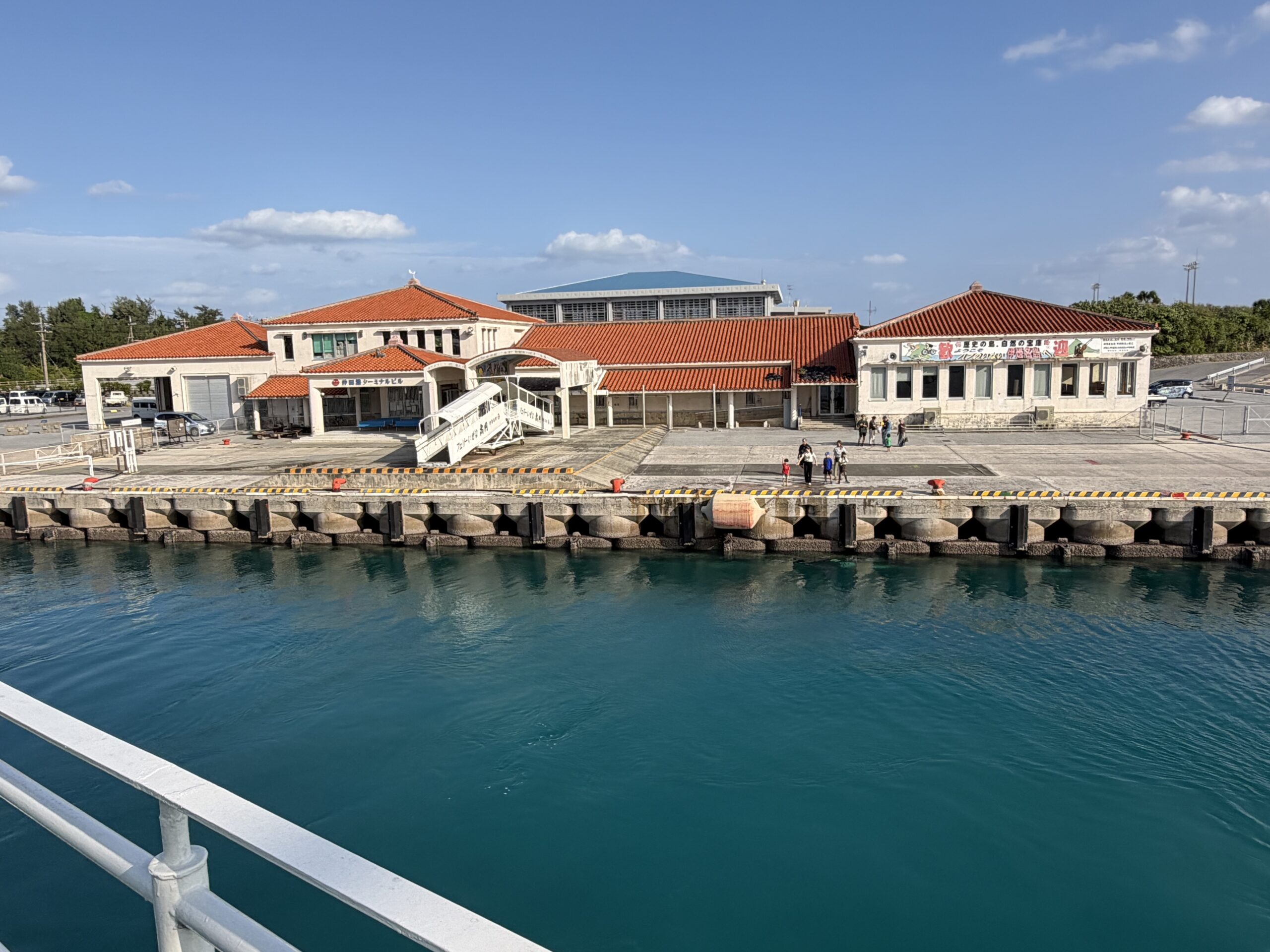 運天港に戻るフェリーは9時に仲田港を出港します。岸壁には別れを惜しんで紙テープをもつ人達が。