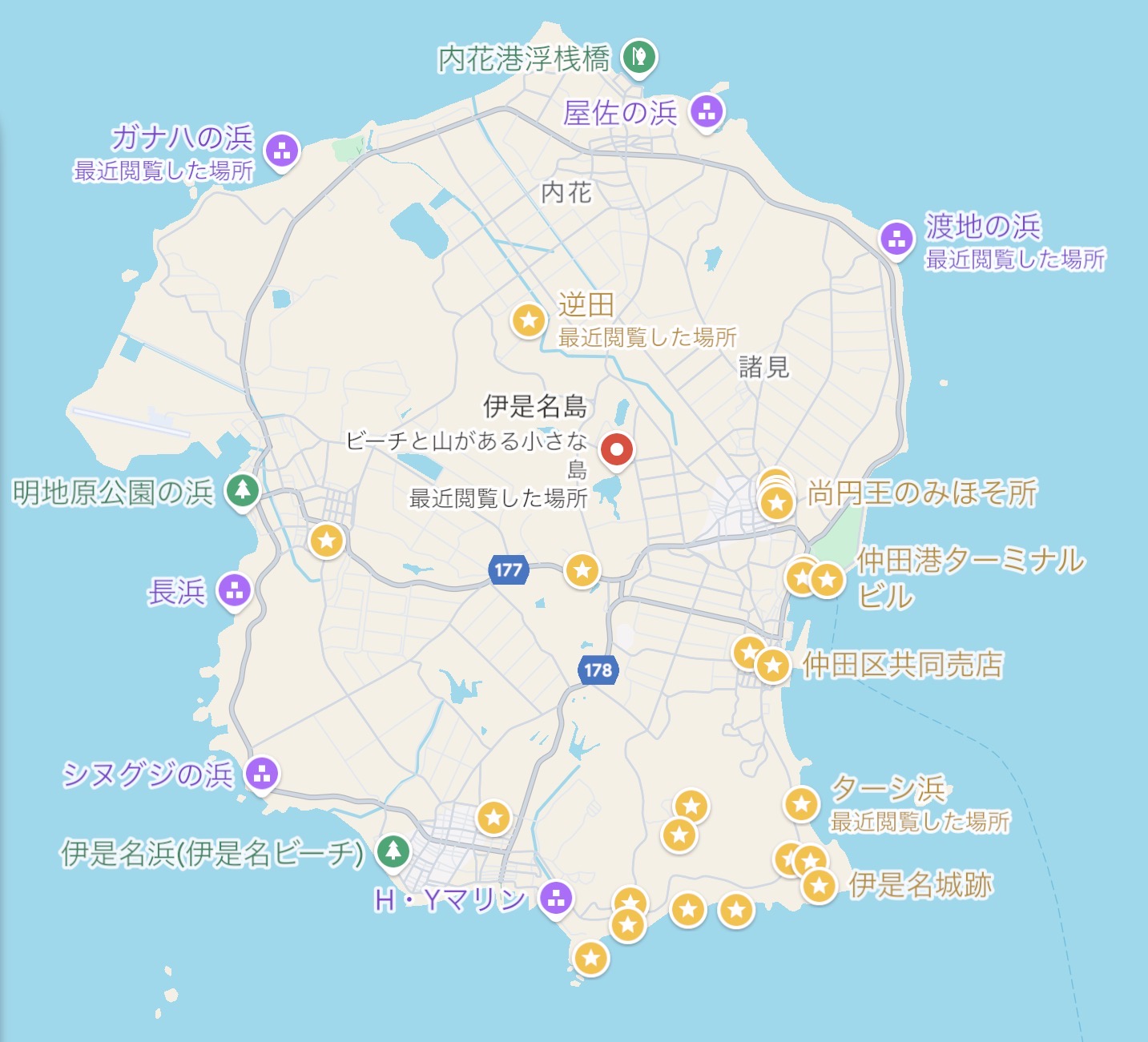 今回の伊是名島訪問で巡った場所をGoogleマップにプロットしました。黄色い箇所が立ち寄った場所です。