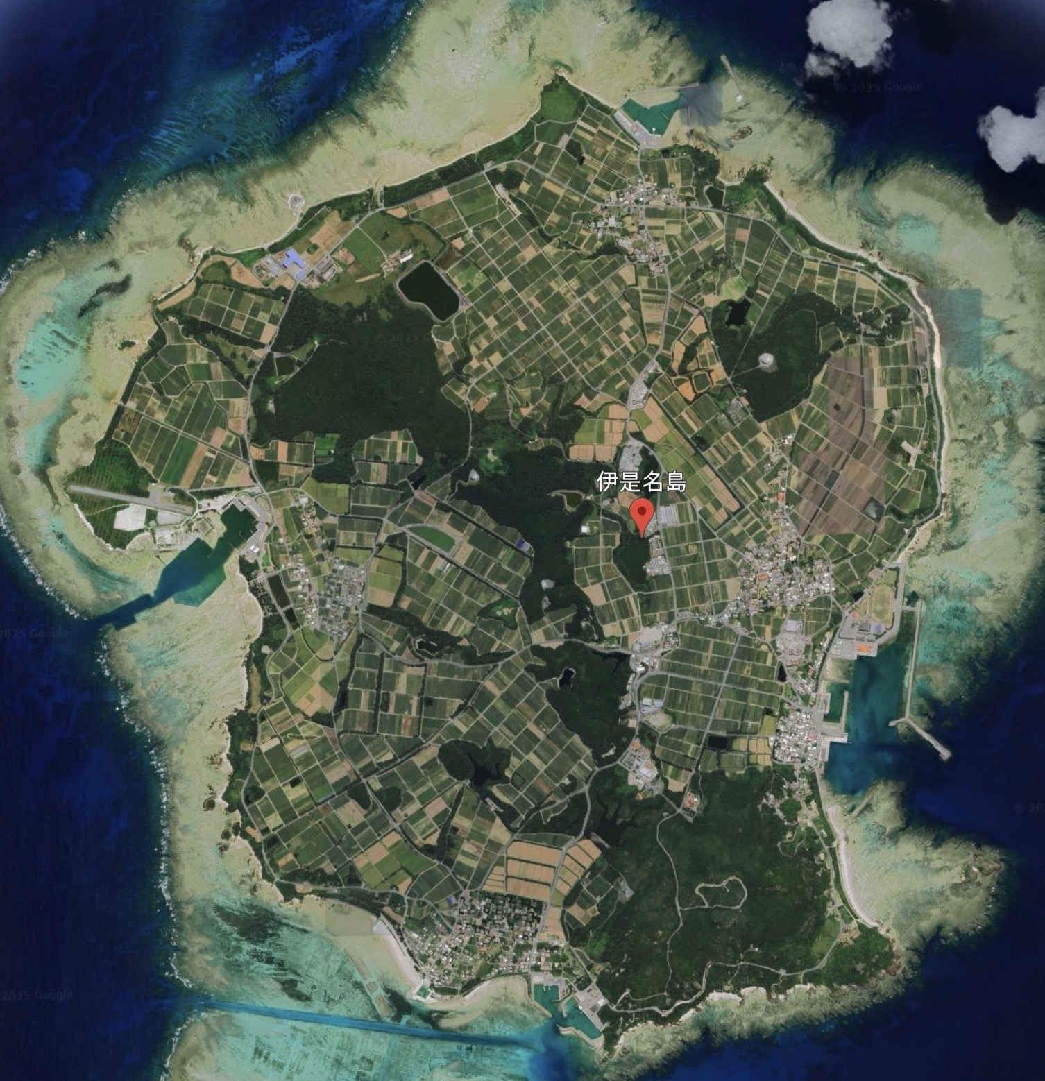 上の写真はGoogle Earthで見た伊是名島です。島中に田んぼや畑があることが判ります。この小さな島でこれだけの農地を潤す水が得られているのは驚きです。