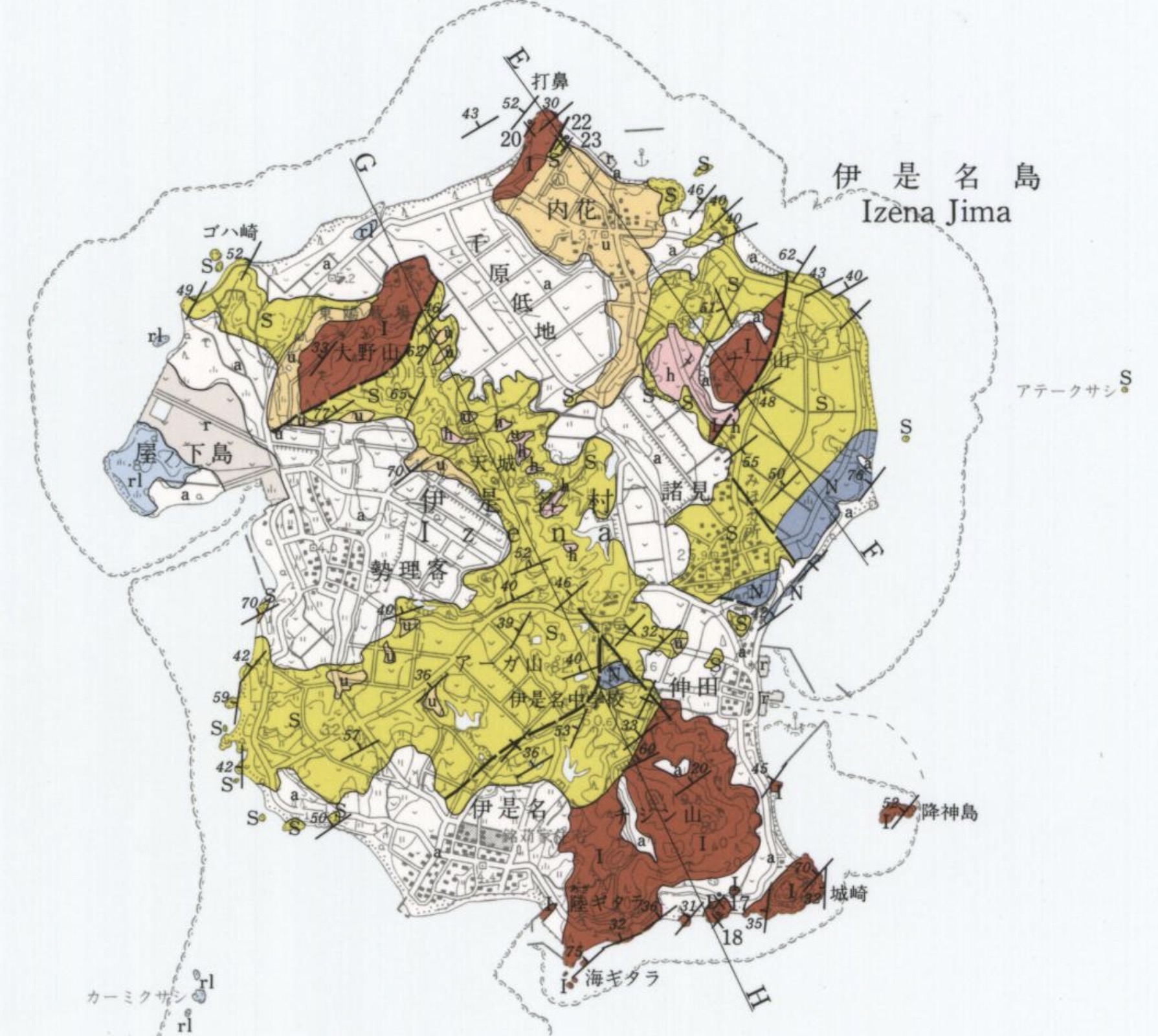 論文にあるように島の南側はほぼチャート(茶色)、低くなっているところは礫や砂や泥で(白)構成されています。南側に岩山と海岸の岩場が多いのはこうしたチャート層が陸地から海にかけて分布しているためなのでしょう。琉球石灰岩は西側の一部にしか見られませんので、一般的な沖縄のイメージとは異なった風景になるのは当然でしょう。大小様々な断層も複雑な地形を生み出す役割を担っていると思われます。