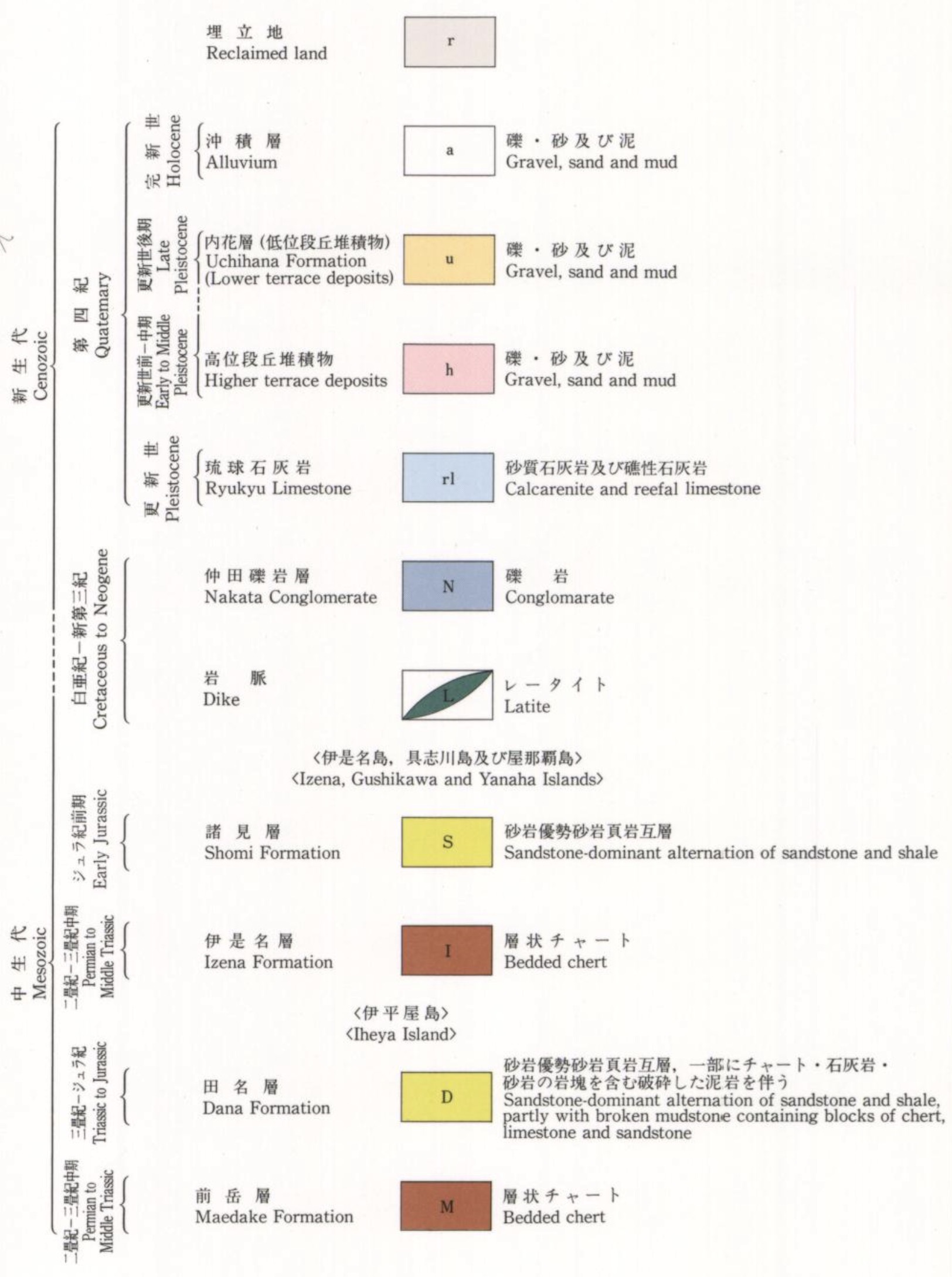 伊是名島南端の沖合い約1.5km に浮かぶ屋那覇島は、具志川島とほぼ同様な面積をもつ。その南部を東西に走る部分と北部に標高5m 強の平らな丘陵が認められ、その間に砂地が広がる。丘陵地は新期の琉球石灰岩で構成されるが、糸満崎の南岸には先第三系チャートの露頭がある。
