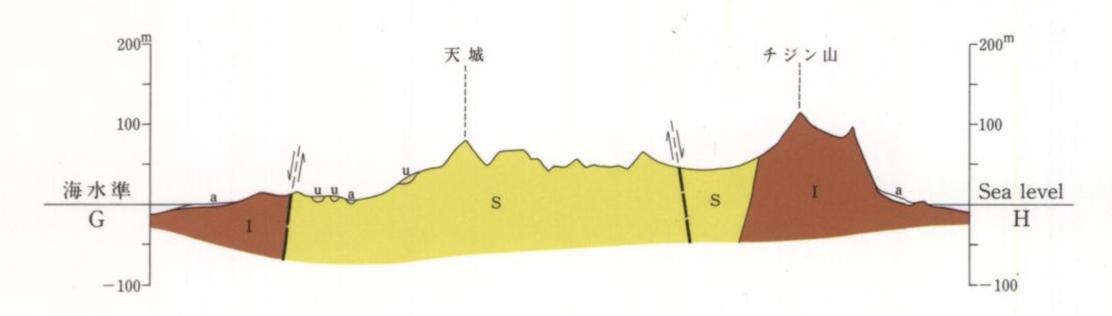 Hは陸ギタラ、海ギタラに一致します。見るとチジン山から海の中までチャート層が続いていることが判ります。