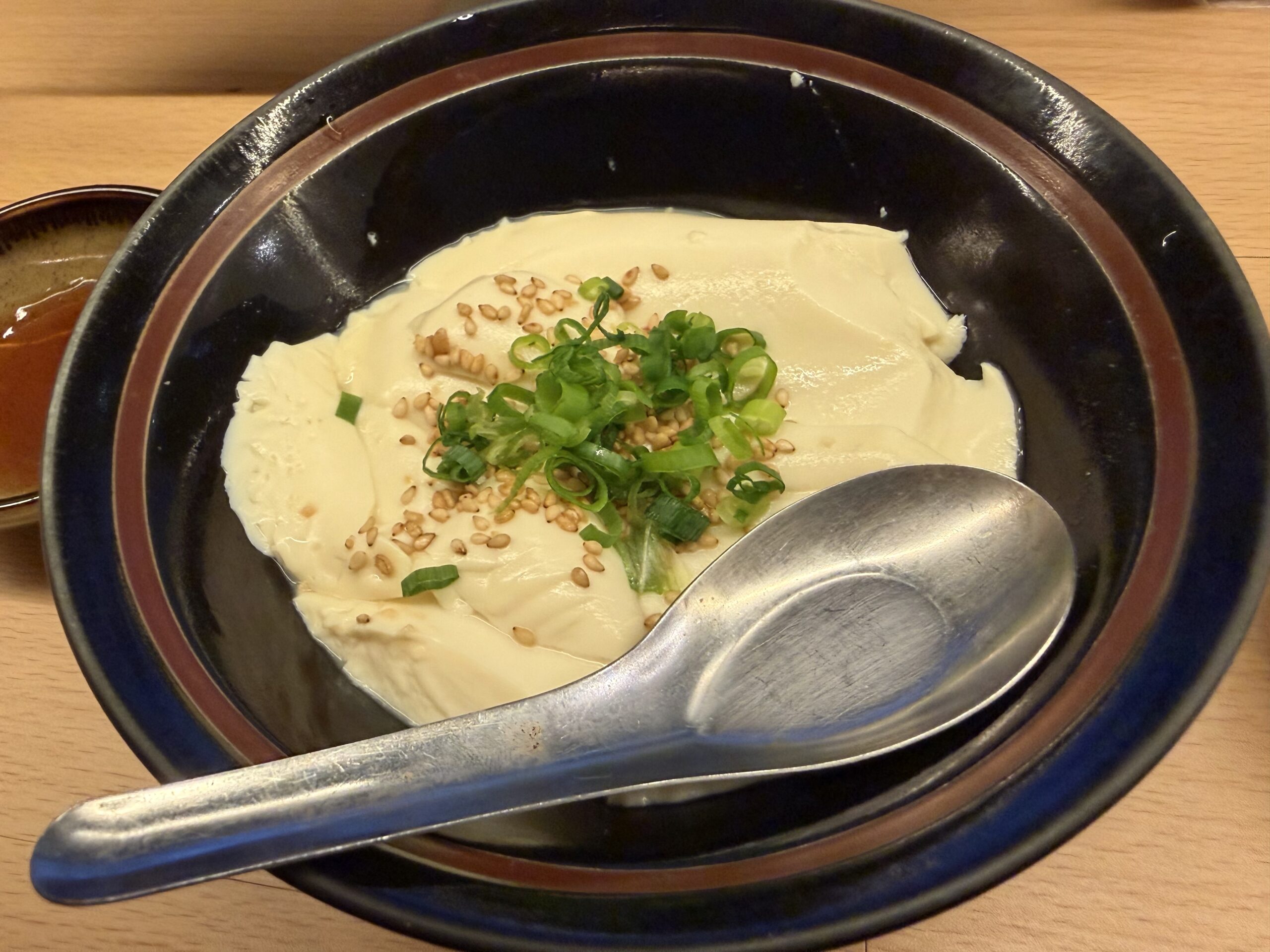 最初に運ばれてきたのは「できたてあちこうこう豆富」です。ポン酢をかけていただきます。