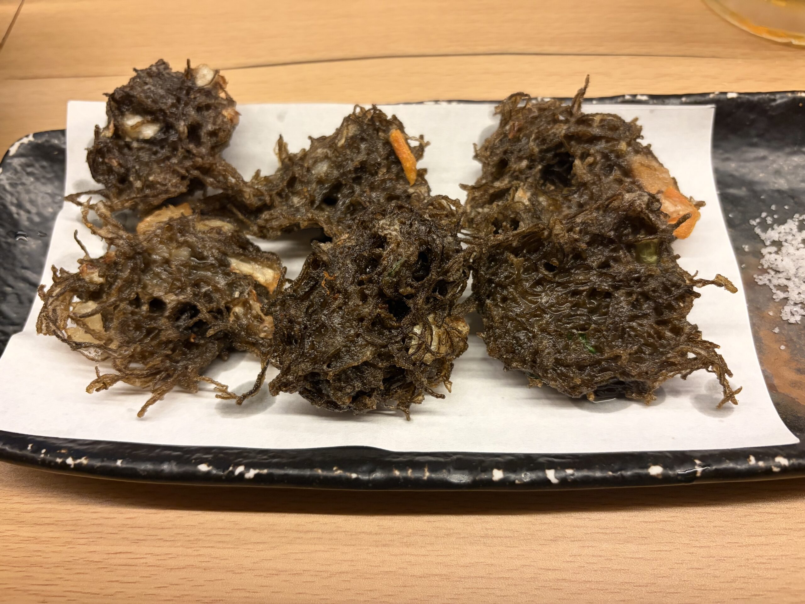 続いて「もずくの天婦羅」が運ばれてきました。塩でいただきます。