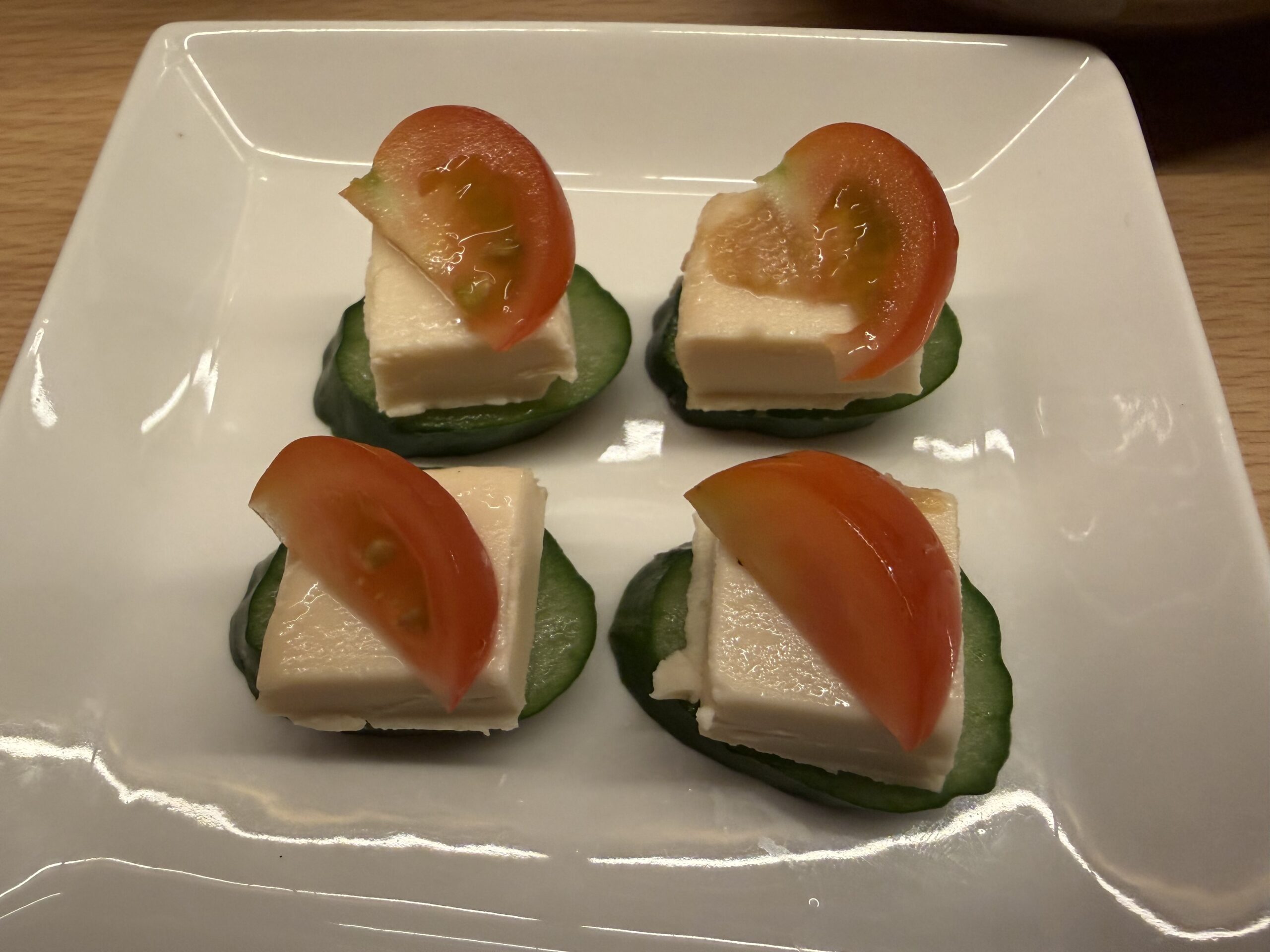 「クリームチーズの味噌漬け(ハーフサイズ)」も運ばれてきました。胡瓜とミニトマトとの組み合わせは初めてでしたが美味しくいただきました。