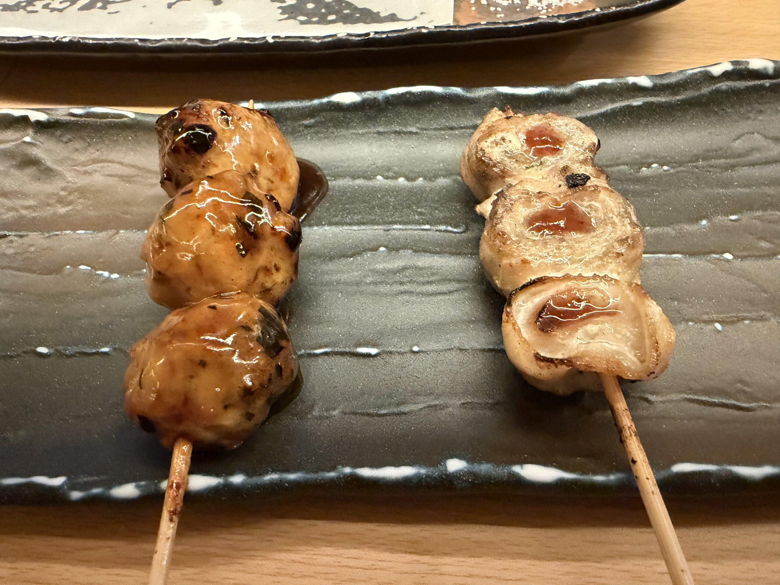 焼き鳥も少し食べてみようと「三枚肉のしそ巻き」と「特製つくね団子」を一串ずついただきました。タレもくどくなくて美味しくいただくことができました。