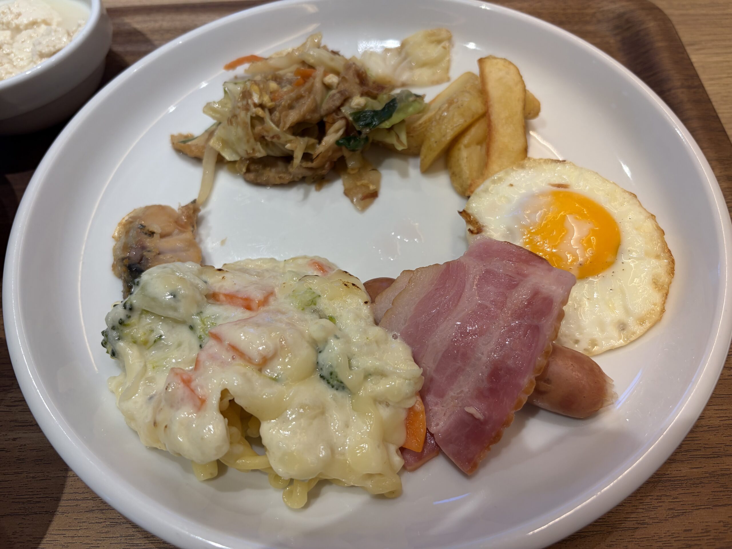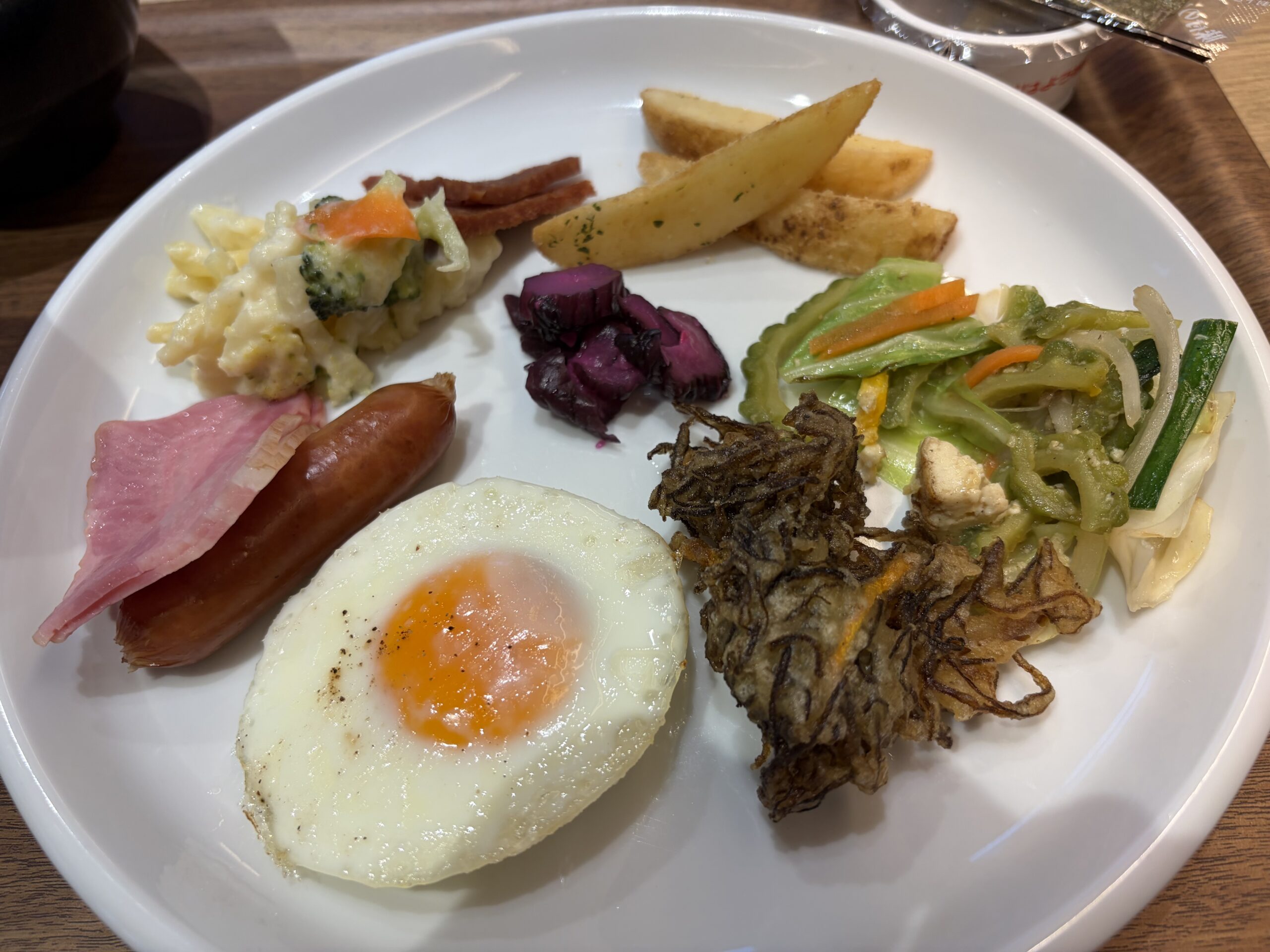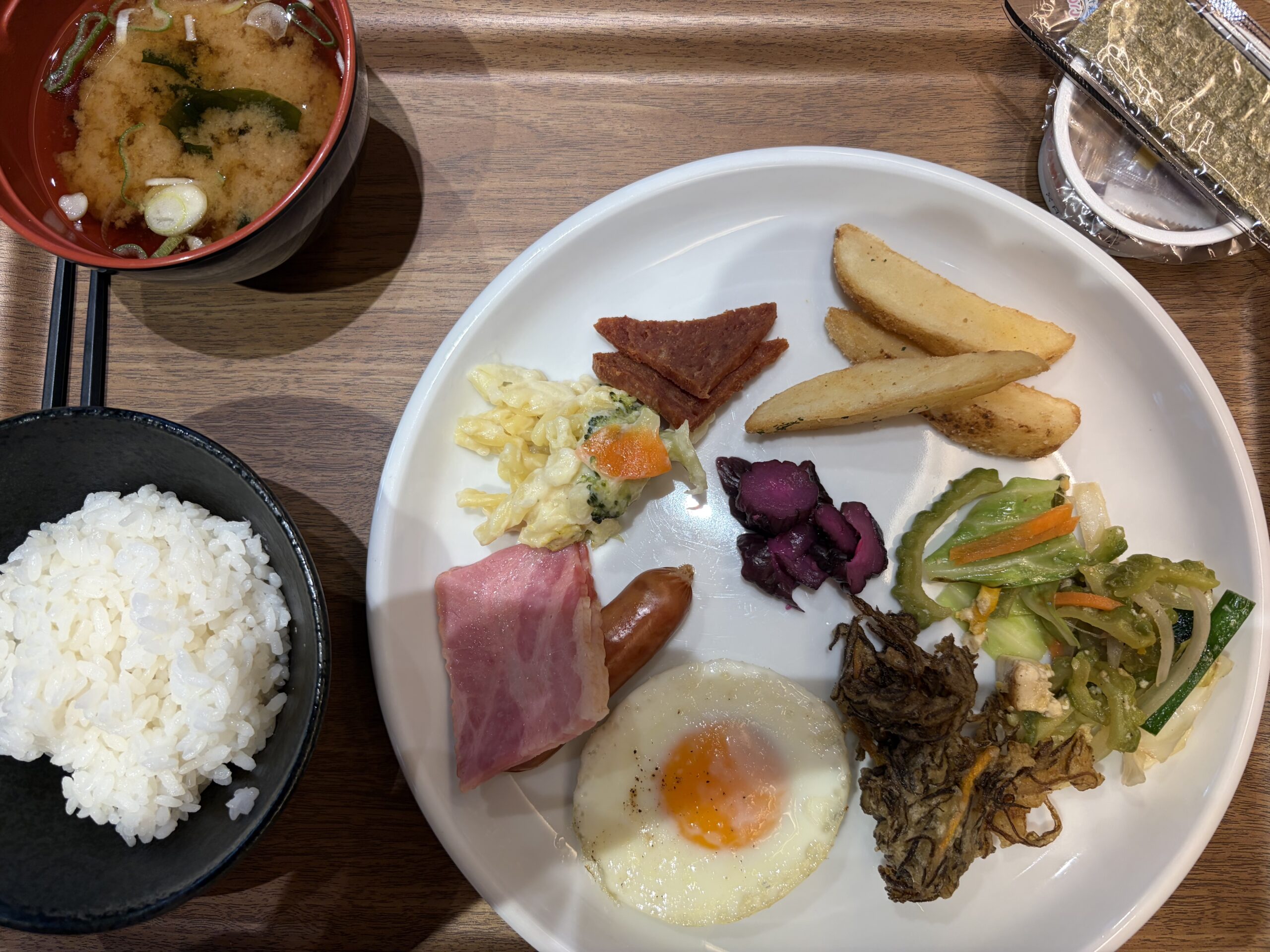 左上から時計回りに(沖縄そばのトッピングだった)ポーク、フライドポテト、ゴーヤチャンプルー、モズク天、目玉焼き、ベーコンとウィンナーソーセージ、パスタのクリーム煮と香の物です。