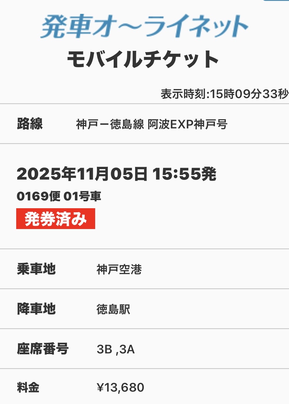 徳島駅行きの高速バスは予定通りの15時55分出発となりました。