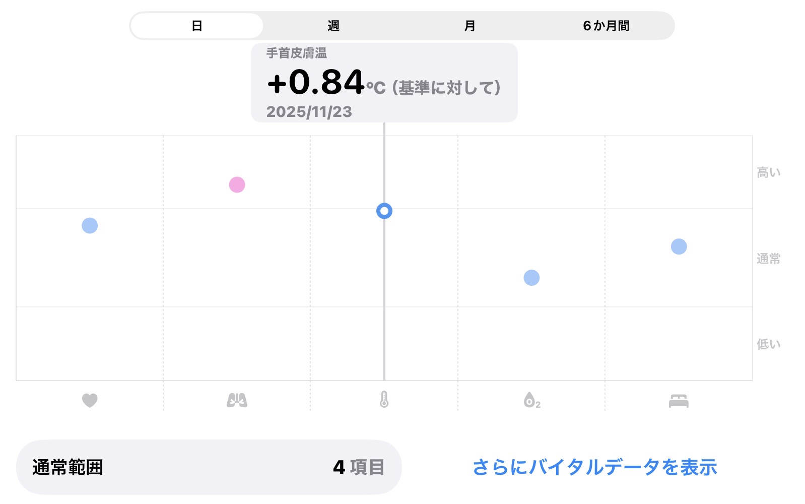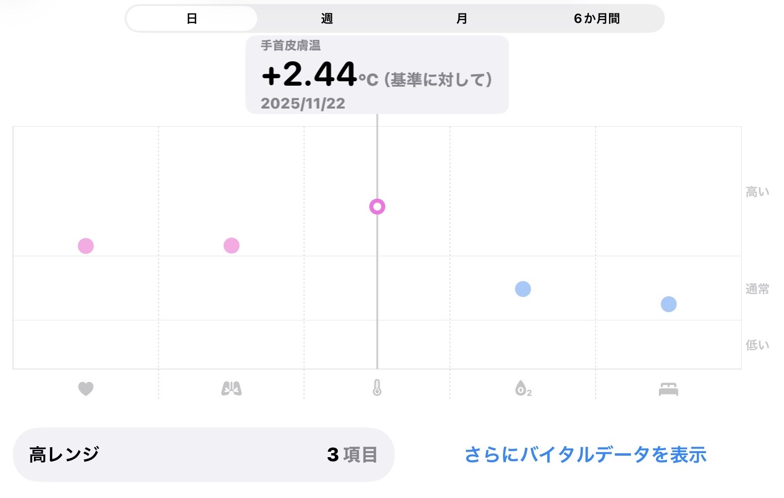 ワクチン接種後しばらくは特に何もなく過ごしていましたが、徐々に体調が悪くなり、いつもより早く床につきました。布団に入ってしばらくすると悪寒に襲われ、なかなか眠ることができませんでした。朝起きてApple Watchで計測したバイタルデータを見て見ると手首皮膚温が平均値より2.44℃高くなっていました。基準値を36℃に設定しているので昨夜の体温は38.44℃だったということが判りました。一番左は心拍数、左から二番目は呼吸数を表していて、呼吸が荒くて心拍数も高かったことが判りました。