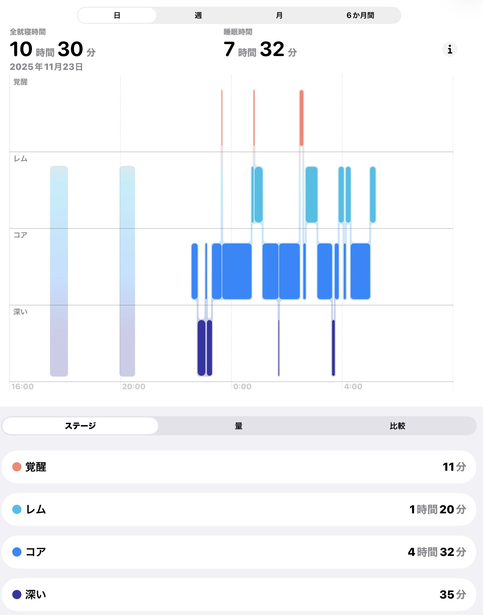 睡眠グラフを見ると6時間29分のうち、目覚めていた時間は1時間48分、眠っていた時間は4時間59分と、眠れていなかったことが良くわかります。実感としてこの通りだったと思います。