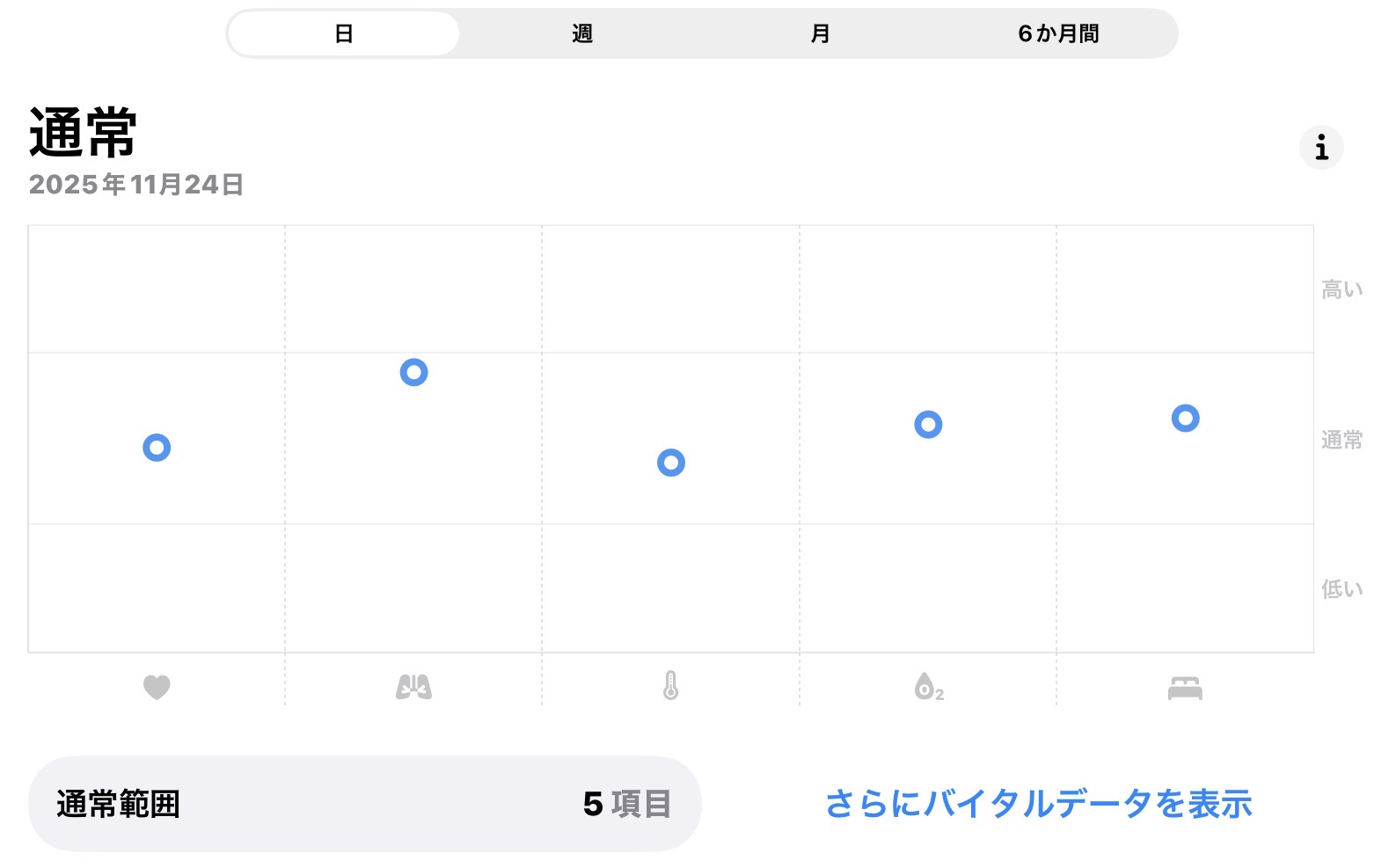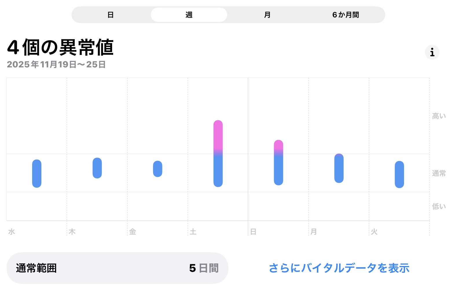 一種間のバイタルデータを並べて見ると接種した21日(金)の夜(上記では「土」)に異常値が出て、翌22日(土)に回復傾向に向かうも異常値は残っていて、三日目の23日(日)に平常状態に戻りかけ、四日目の24日(月)にようやく平常状態に落ち着いたことが分かります。接種跡の痛みもほぼなくなりました。