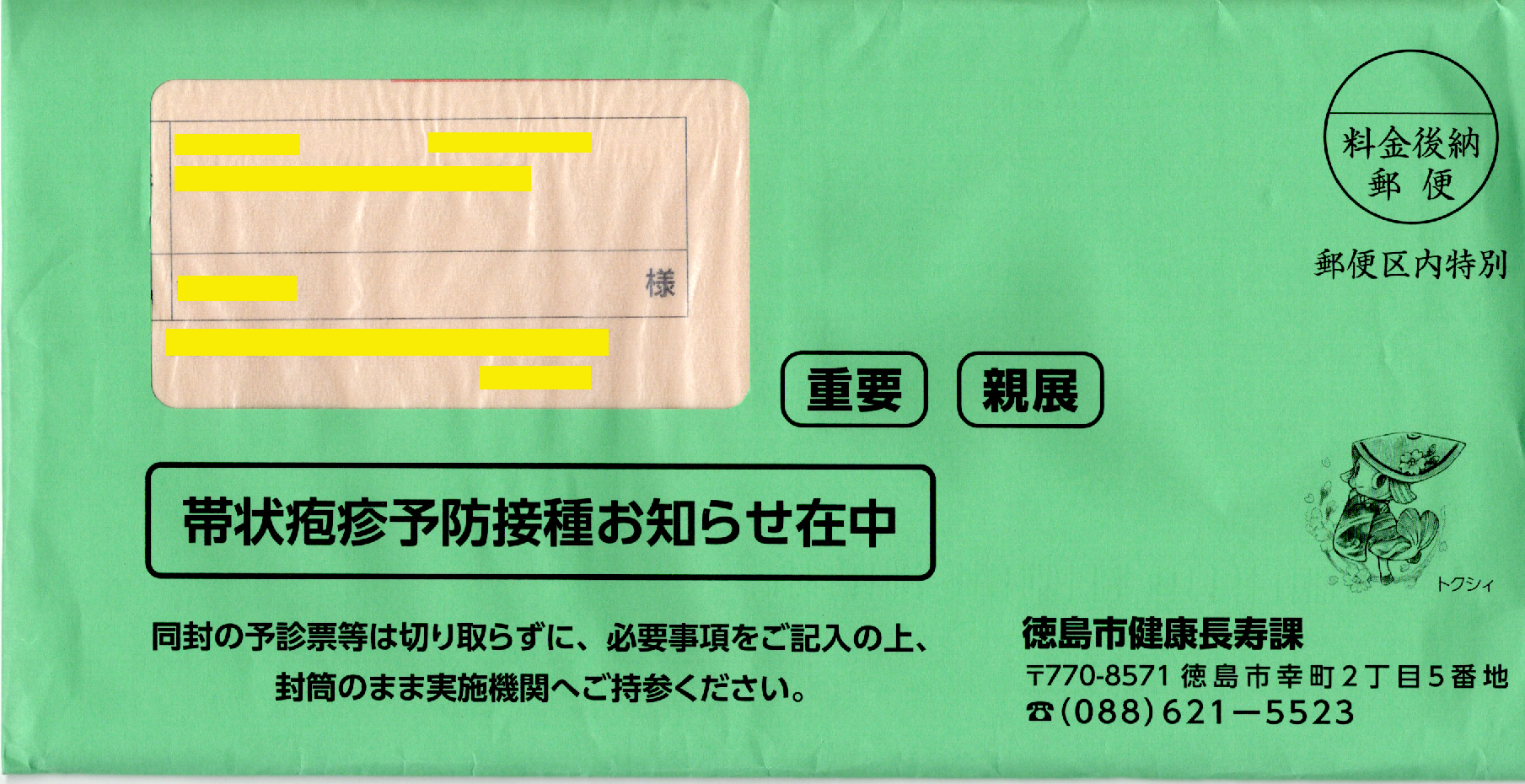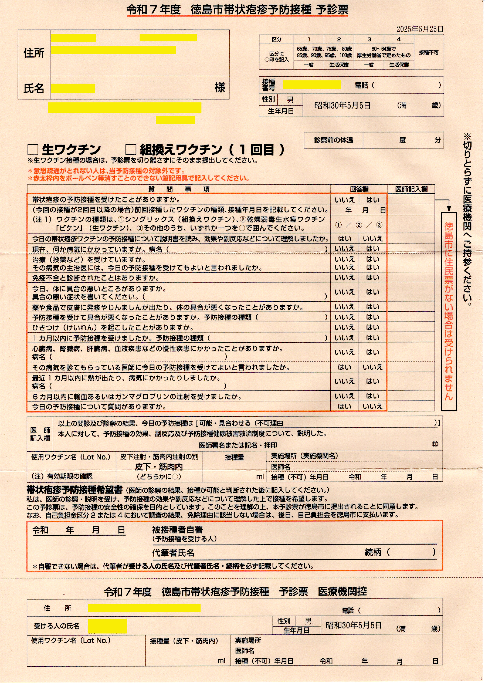 接種するワクチンは二種類あるようで、生ワクチンは一回のみ、組換えワクチンは2ヶ月の間を空けて二回の接種とされています。同封されている資料を見ると、組換えワクチンの方が予防効果が長く続くようですので、面倒ですが組換えワクチンを接種することにしました。