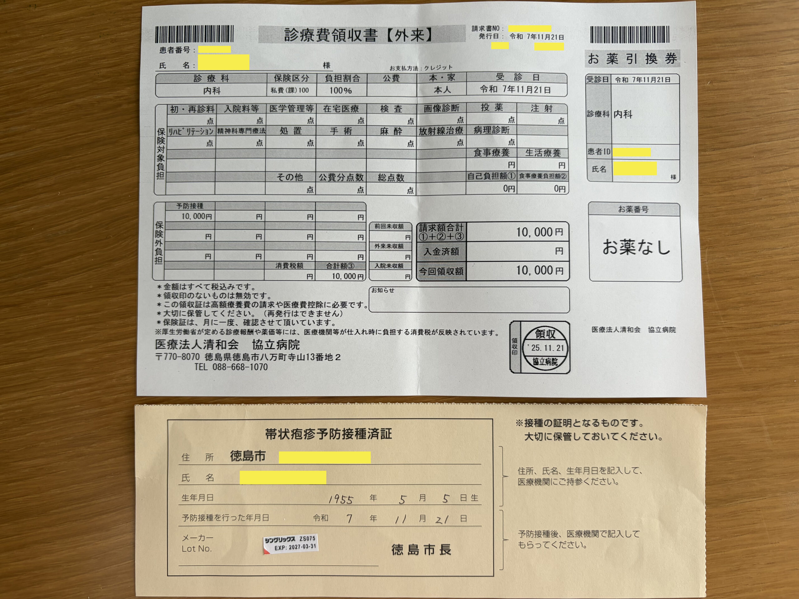 11月17日(月)に協立病院に電話して予約をお願いすると、いつが良いかと聞かれたので21日(金)と答えると午前中にとのことでした。組換えワクチンでとお願いしました。