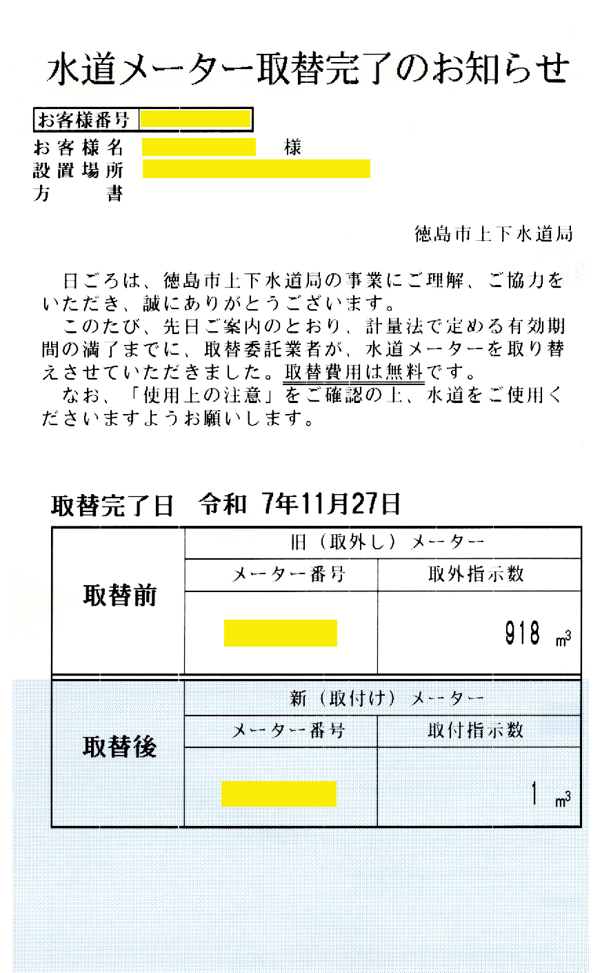今日、買い物から帰ってきた時に工事業者らしき車が近くの家の前に停まっていました。我が家とほぼ同じ頃に団地に入居した方の家だったので、すぐ後で担当業者の方がお越しになりました。15分ほどで交換が終わるとのこと。徳島市のホームページに書かれているように8年毎にメーター交換をするとのことでした。15分ほどで交換が終わって取替完了通知をいただきました。