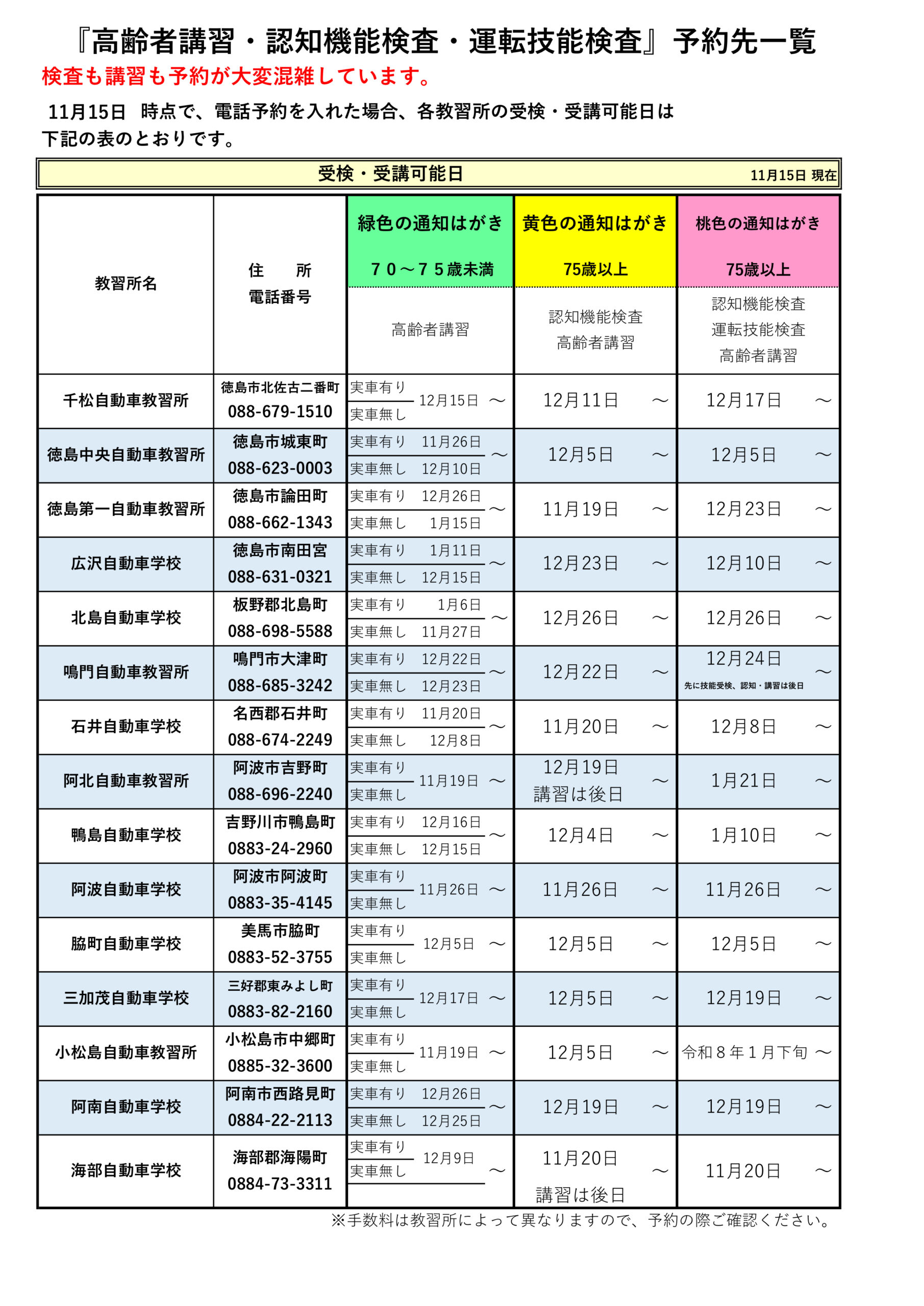 徳島県警のホームページには高齢者講習や認知機能検査などについて掲載されていました。届いたハガキは緑色なので70歳〜75歳未満での免許更新前の高齢者講習案内で、75歳以上になると認知機能検査や運転技能検査が追加されるようです。