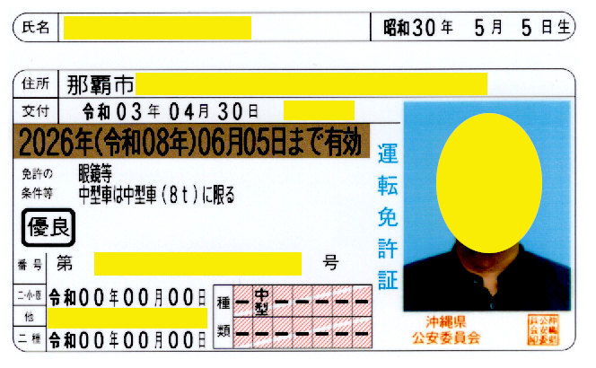 私の運転免許証の有効期限は令和3年(2021年)4月30日に沖縄で更新したので、来年(2026年)6月5日が有効期限になっています。