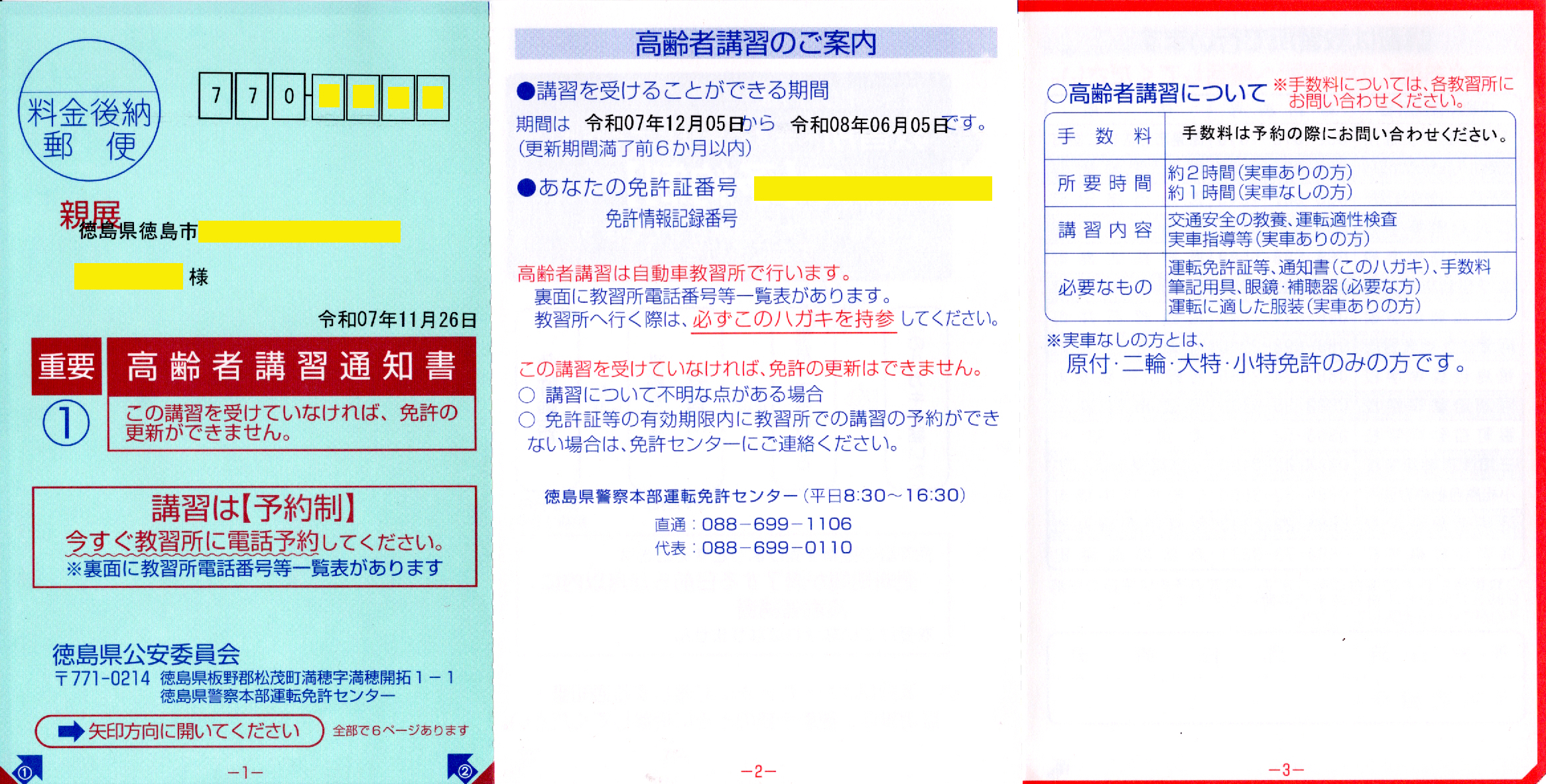 いずれ来るだろうと思っていた高齢者講習通知の案内ハガキが今日届きました。